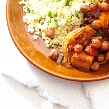 Couscous: Bouillon (300 ml) erhitzen, Couscous (300 g) dazugeben und zugedeckt 5 Minuten quellen lassen.
