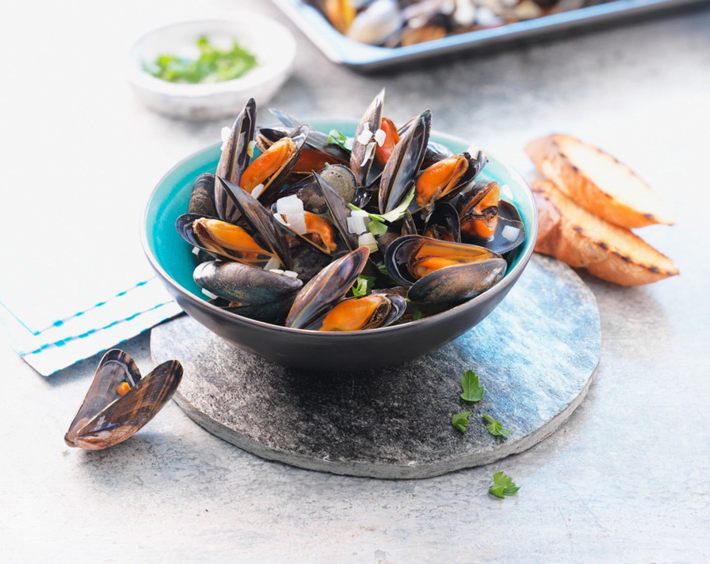 Muscheln (1.5 kg) gründlich waschen und, falls vorhanden, den Bart entfernen. Die Zwiebel (1) schälen und fein schneiden. Die Petersilie (100 g) waschen und fein hacken