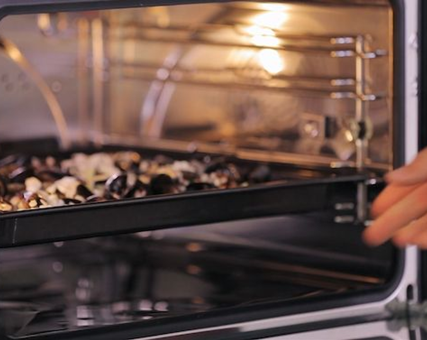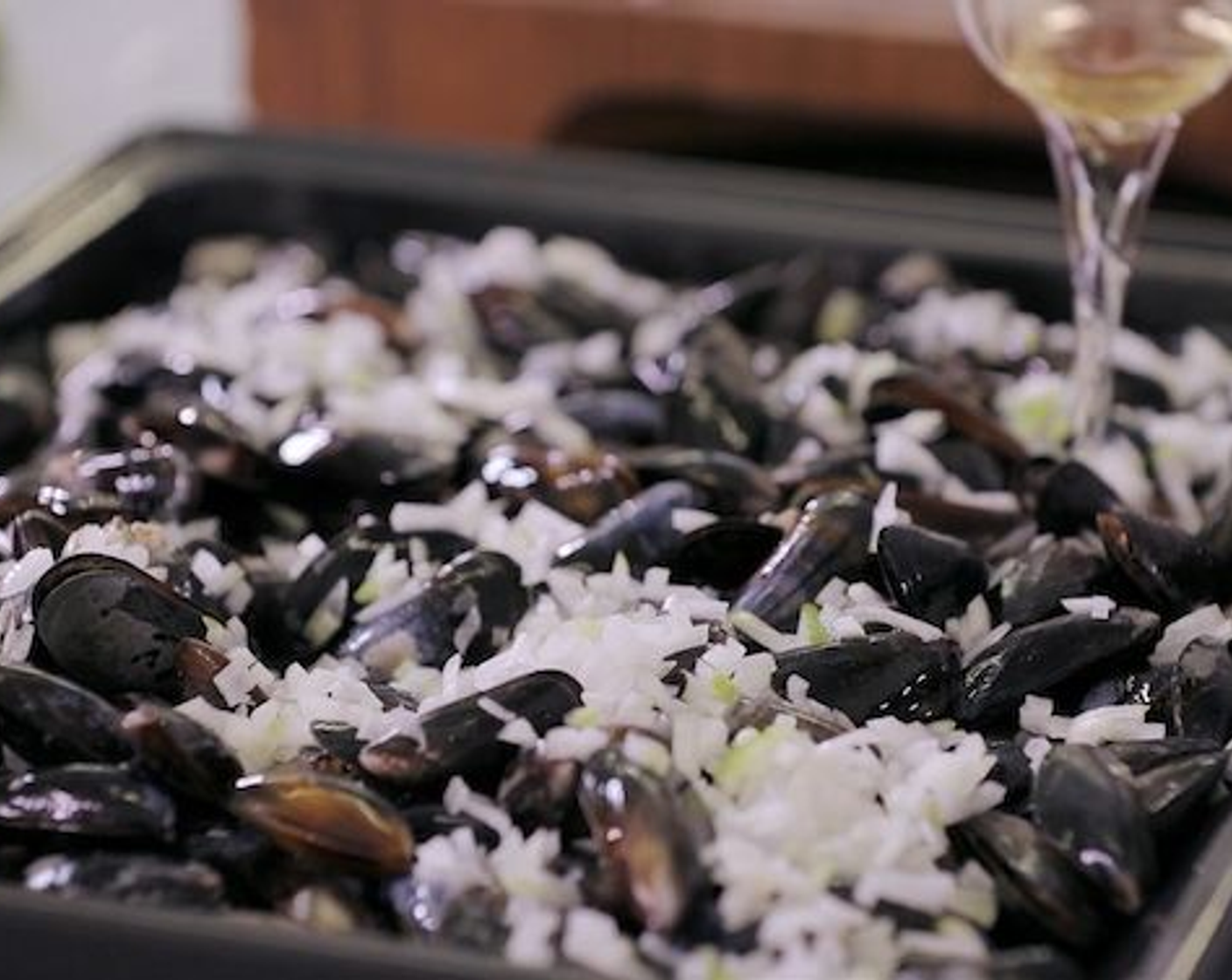 Anschliessend die Muscheln zusammen mit dem Weisswein (200 ml) und den Zwiebeln auf ein Backblech geben. Danach das Blech in den vorgeheizten Ofen zum Garen schieben.
