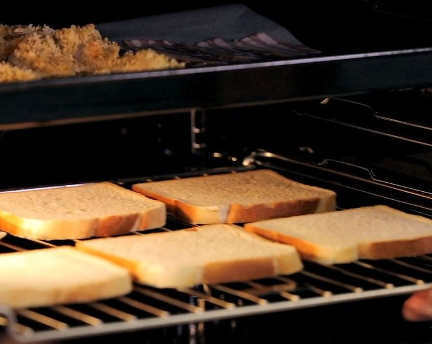 Dann das Backblech auf Auflage 1 und den Gitterrost mit dem Toast auf Auflage 3 in den vorgeheizten Ofen zum Backen schieben.