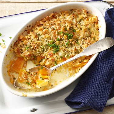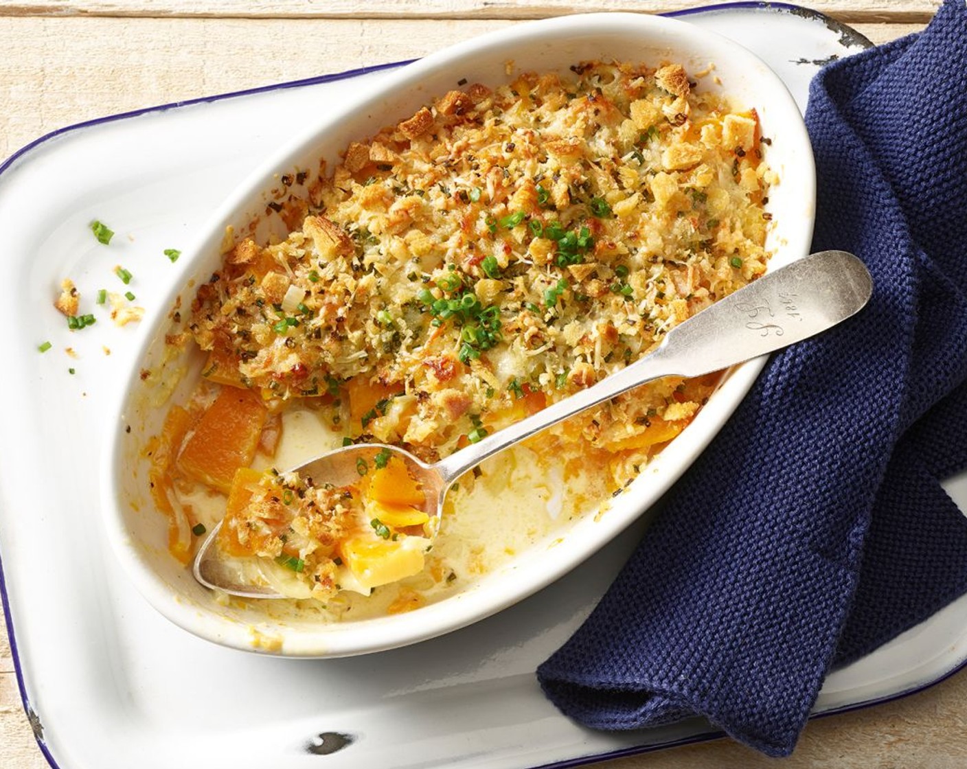 Dieser Kürbisgratin ist eine tolle Alternative zu Kartoffelgratin und kann als vegetarisches Gericht sowie als Beilage zu Fleischgerichten serviert werden.