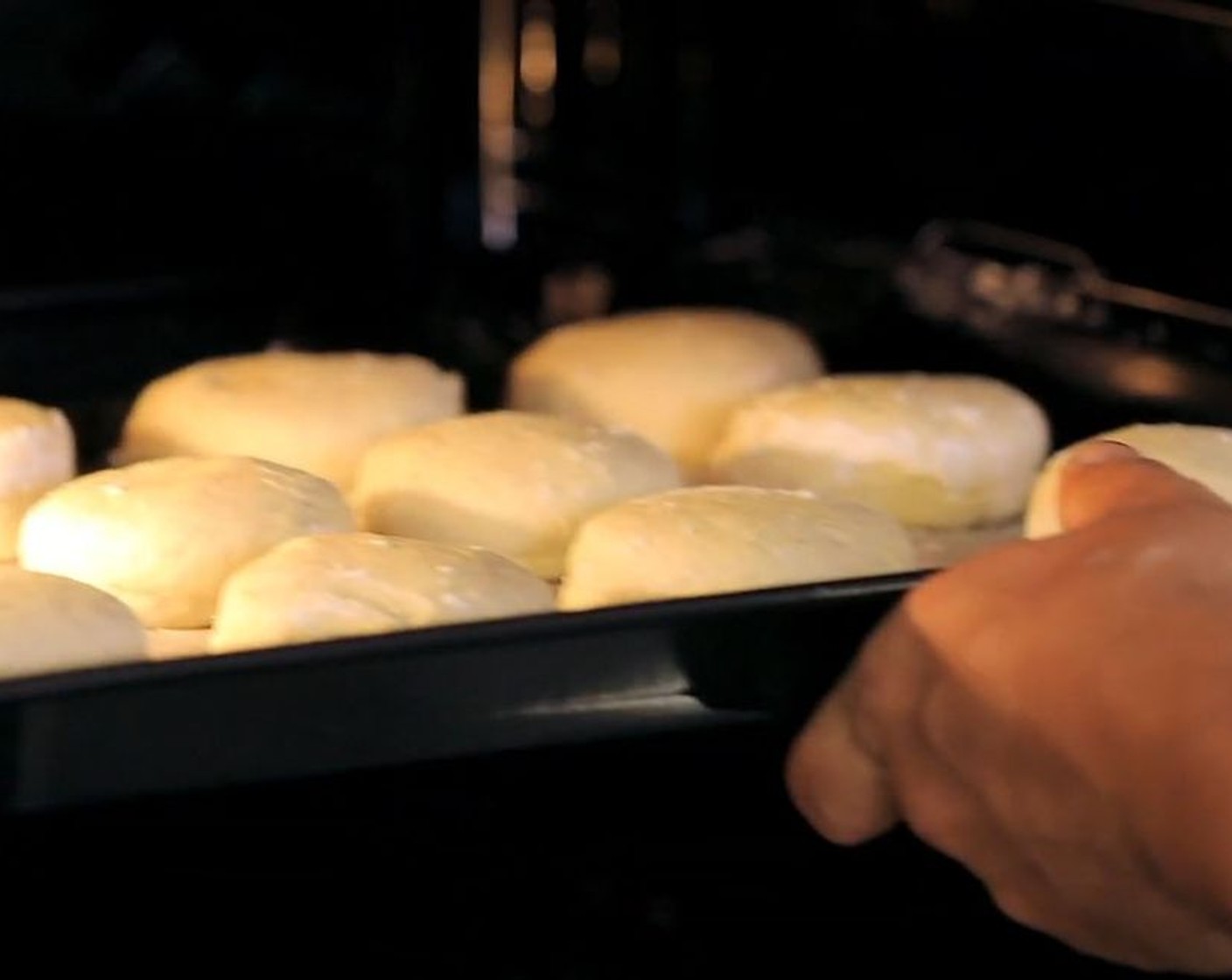 Anschliessend etwas Mehl auf die Arbeitsfläche geben. Teig ca. 2 cm dick, flach drücken und mit einem runden Ausstecher (ca. 6 cm) Kreise ausstechen. Danach die Scones auf ein mit Backpapier belegtes Blech legen und in den vorgeheizten Ofen zum Backen geben.