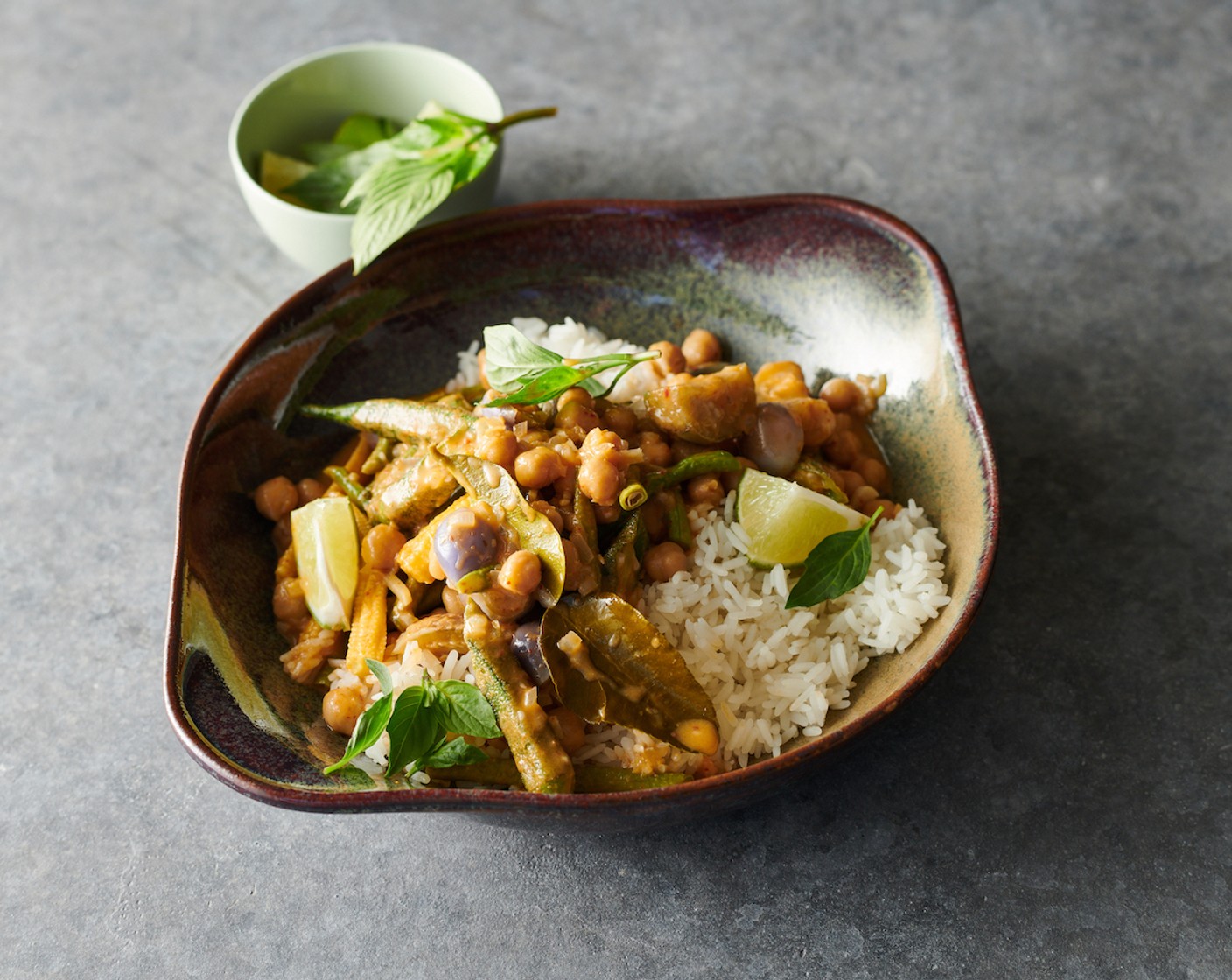 z. B. Thai-Gemüsemischung, Bohnen, Champignons, Lauch, Kürbis, Kefen, Krautstiel, Rüebli, Blattspinat