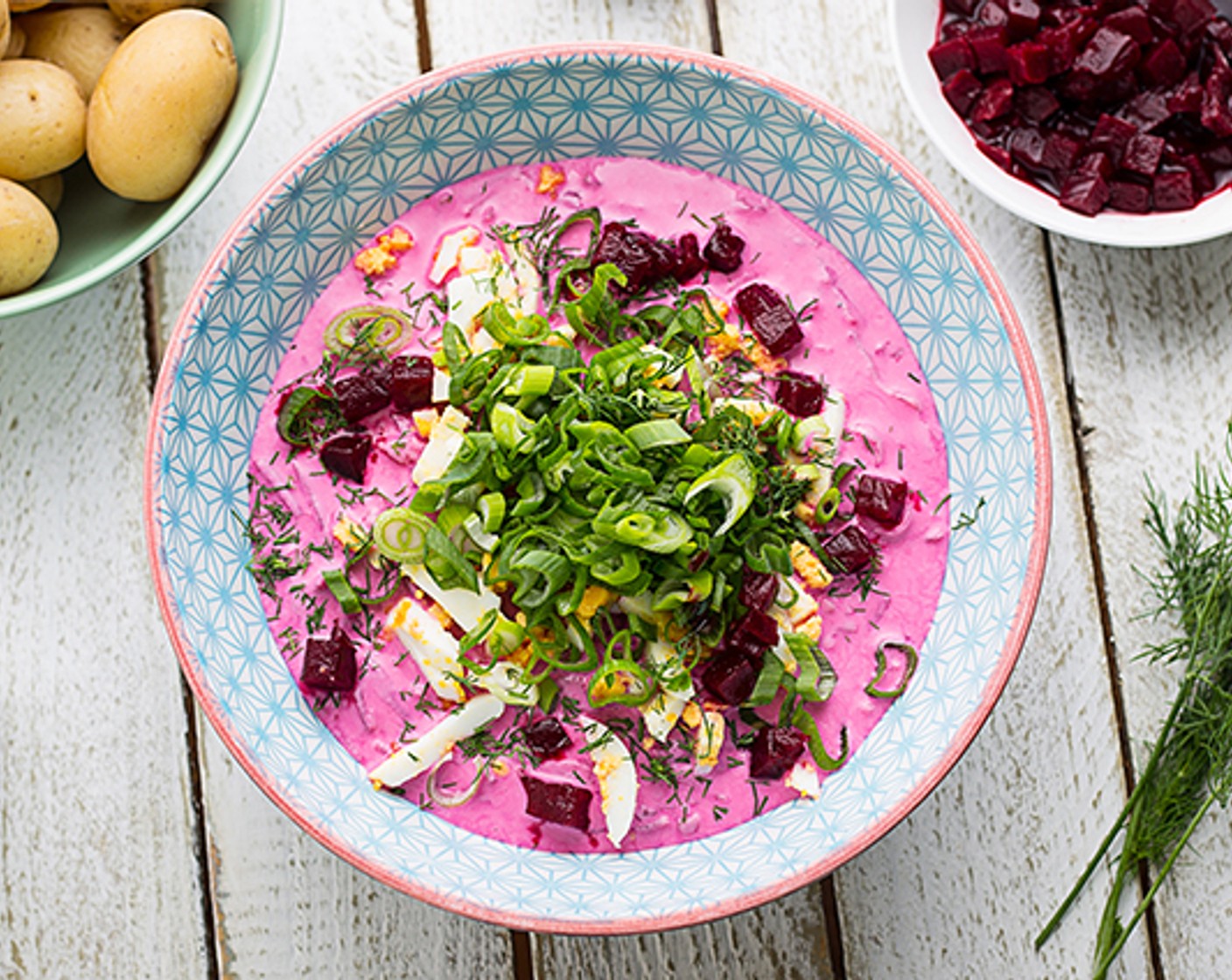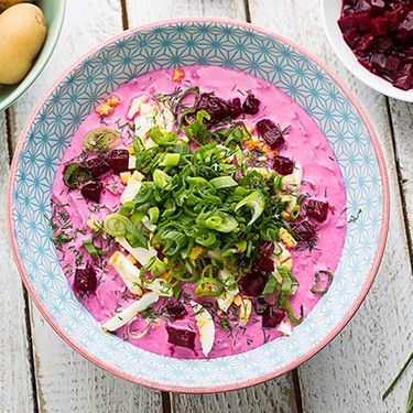 Diese Suppe sticht ins Auge! Die darin enthaltene Rande verleiht der Borschtsch die markante purpurrote Farbe.