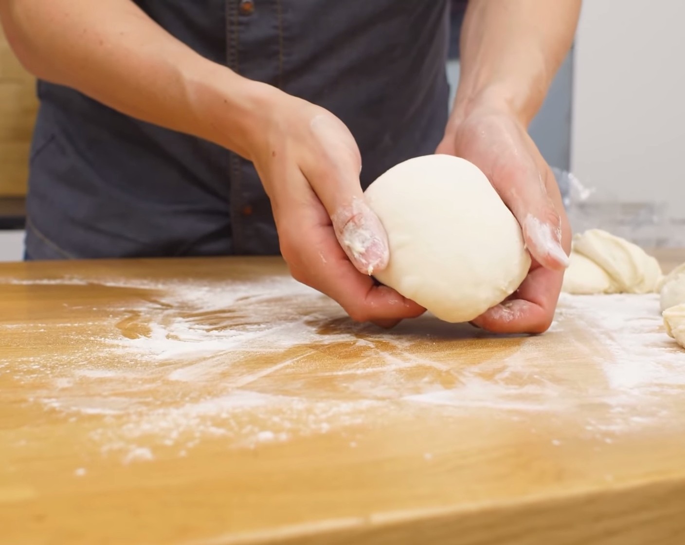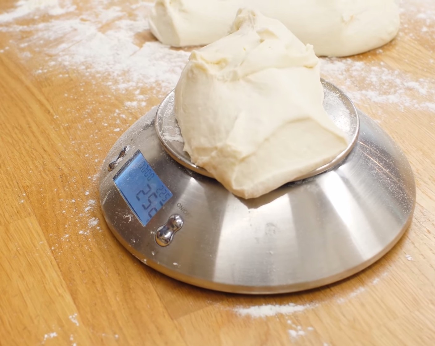 Nach 60 Minuten den Teig auf eine bemehlte Arbeitsfläche geben und Stücke zu je 250 g portionieren. Diese Teigportionen zu je einer Kugel formen. Dazu den Teig 2-3 Mal über den Tisch ziehen um eine glatte Oberfläche zu erhalten. Dabei den Teig mit den Fingern von einer Seite zur Mitte ziehen und leicht andrücken. Diesen Vorgang von allen Seiten wiederholen und den Teig immer wieder in die Mitte falten.