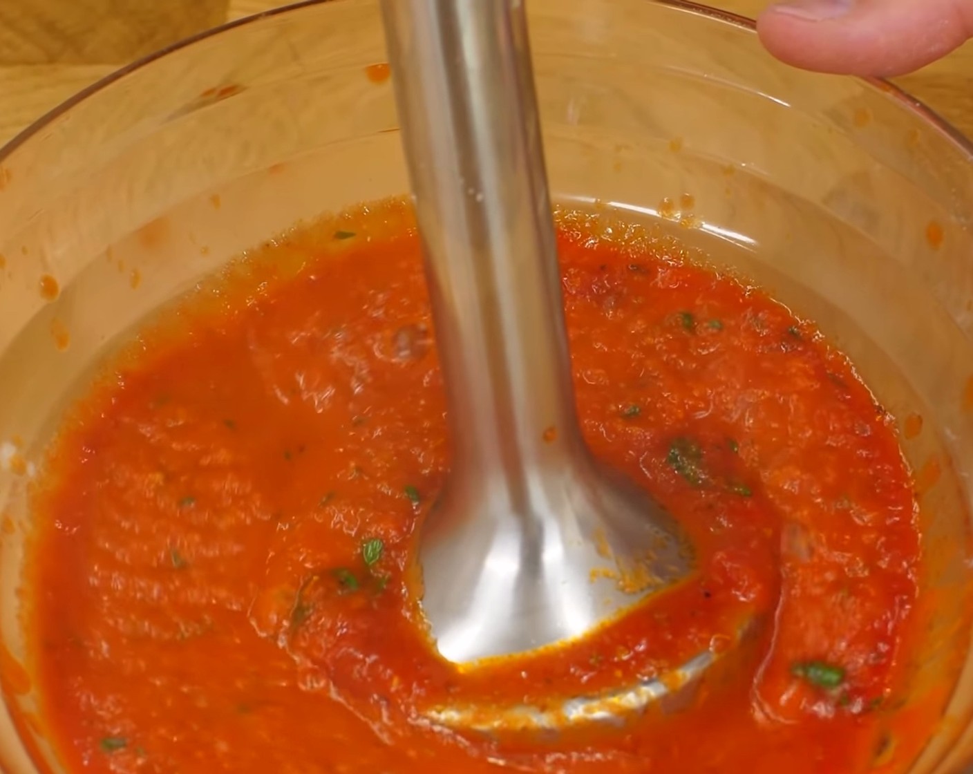 Als nächstes die Sauce in eine Schüssel geben und gut pürieren. Danach die Sauce mit Frischhaltefolie zudecken und bis zur Weiterverwendung in den Kühlschrank stellen.