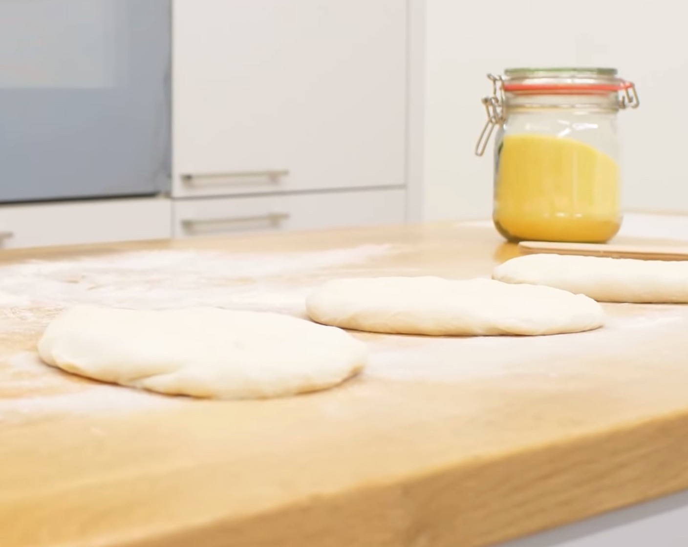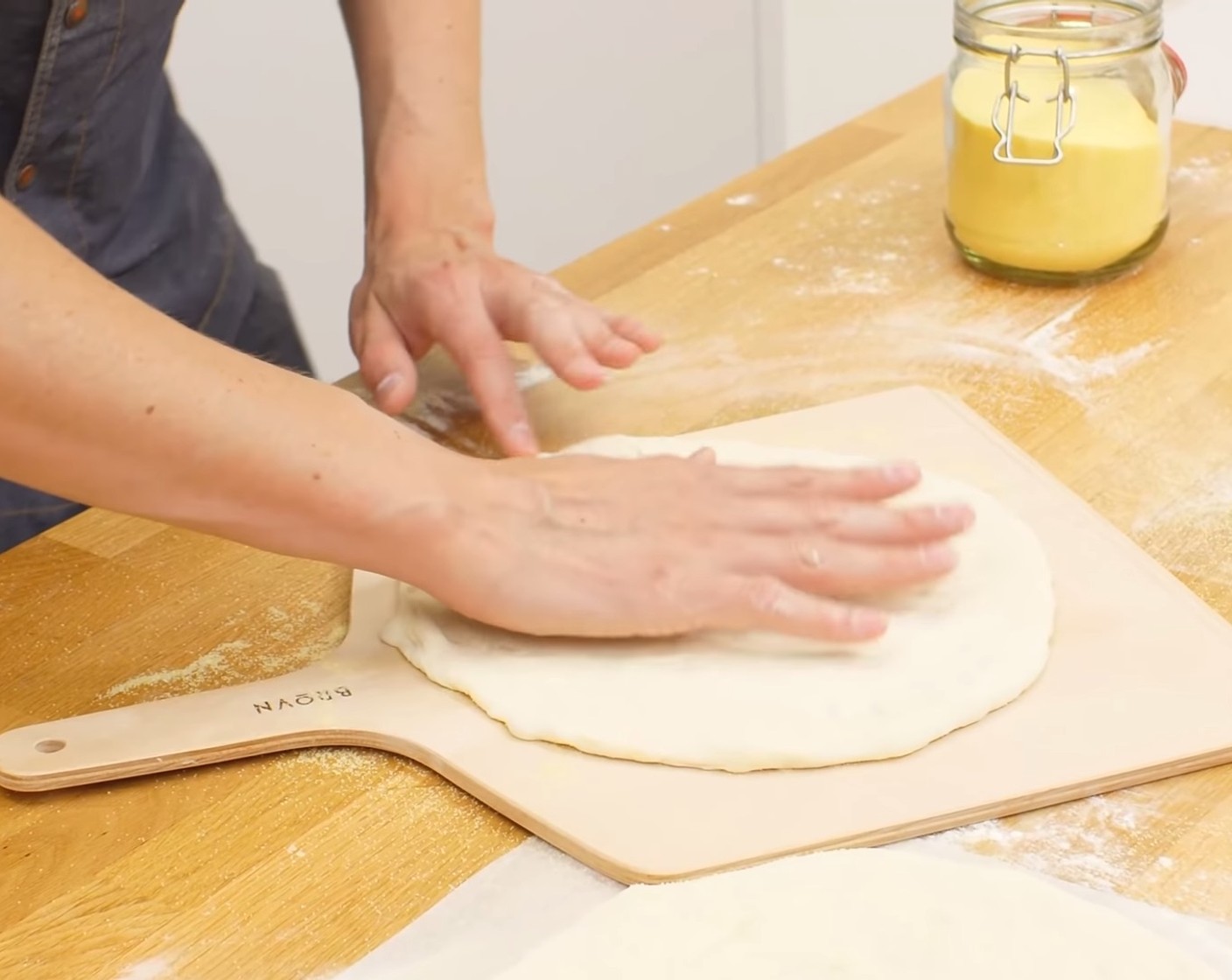 Im Anschluss, die geformten Pizzaböden entweder auf ein Backpapier oder auf eine mit Hartweizengriess bestreute Pizzaschaufel legen.