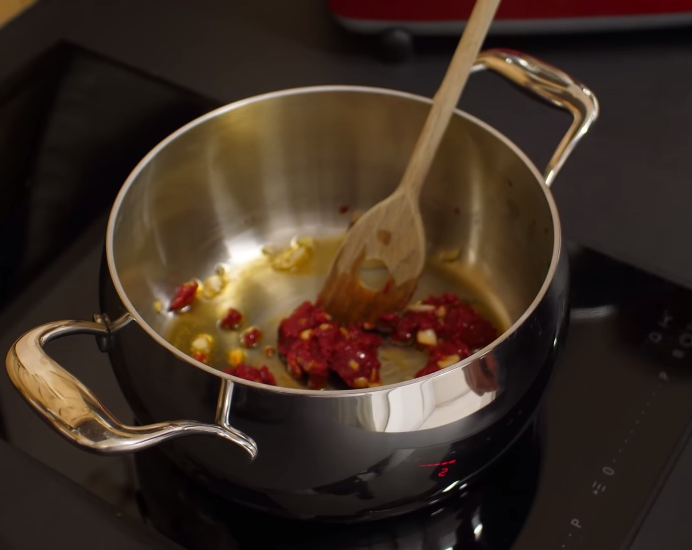 Tomatensauce: Einen Kochtopf auf dem Herd etwas vorheizen. Die Knoblauch (2 Zehen) und die Basilikumblätter (4) fein schneiden. Danach den geschnittenen Knoblauch mit dem Olivenöl (15 g) und dem Tomatenmark (100 g) in den vorgeheizten Kochtopf geben und etwas anschwitzen.