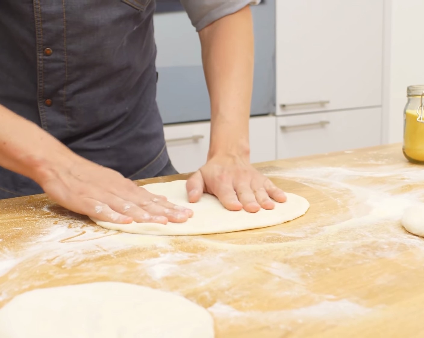 Fertigstellung der Pizzen: Nach der Gärzeit die Teiglinge auf eine bemehlte Arbeitsfläche geben und leicht flach drücken. Danach etwas Hartweizengriess (nach Bedarf) auf die Arbeitsfläche geben, das Teigstück darauf legen und durch sanften Druck das Teigstück ringsum zu einem Kreis auseinander.
