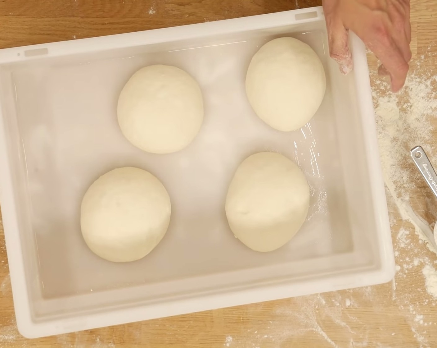 Anschliessend eine grosse Kunststoffbox mit Öl auspinseln und die Teigkugeln hineinlegen. Danach die Kunststoffbox verschliessen und für mind. 24-48 Stunden in den Kühlschrank stellen.