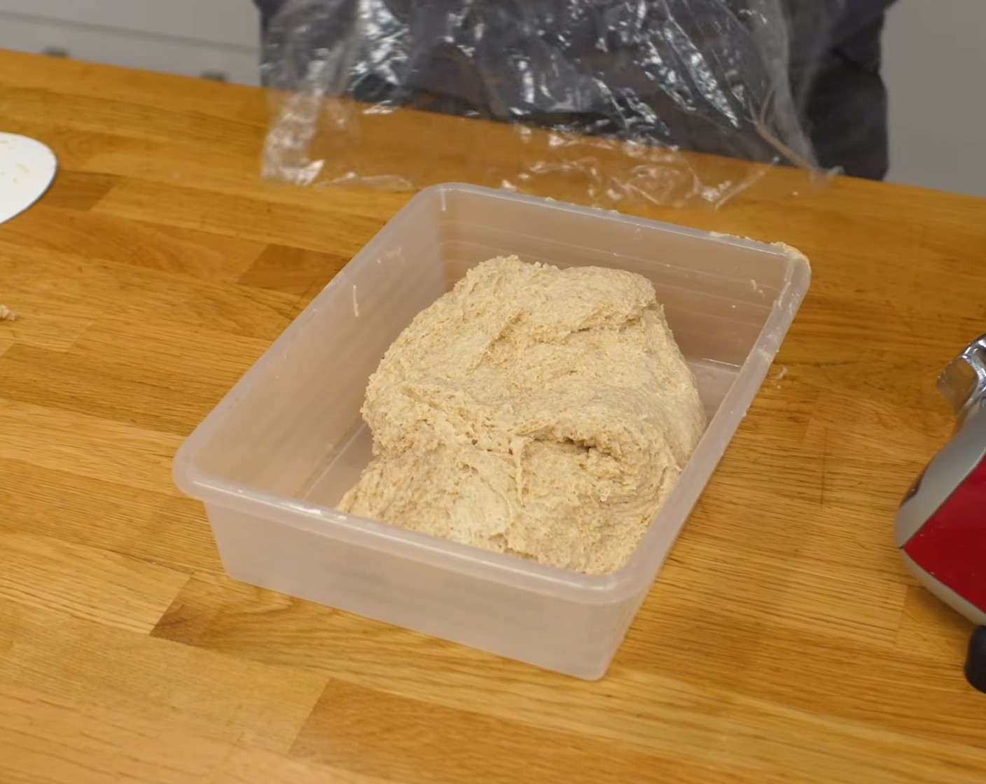 Anschliessend ein grosses - am besten rechteckiges und flaches – Kunststoffbecken mit neutralem Öl (wenig) ausfetten und den Teig hinein legen. Den Teig mit einem Teigtuch (Gärfolie) oder Plastik zudecken und für 10-12 Stunden bei Raumtemperatur gären lassen.