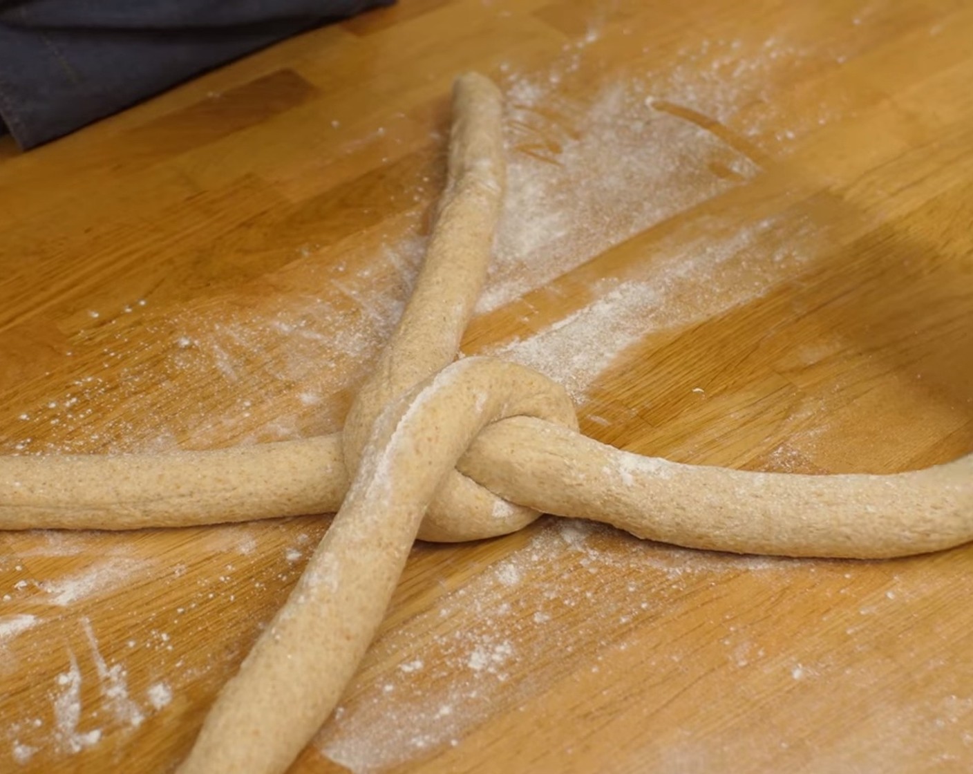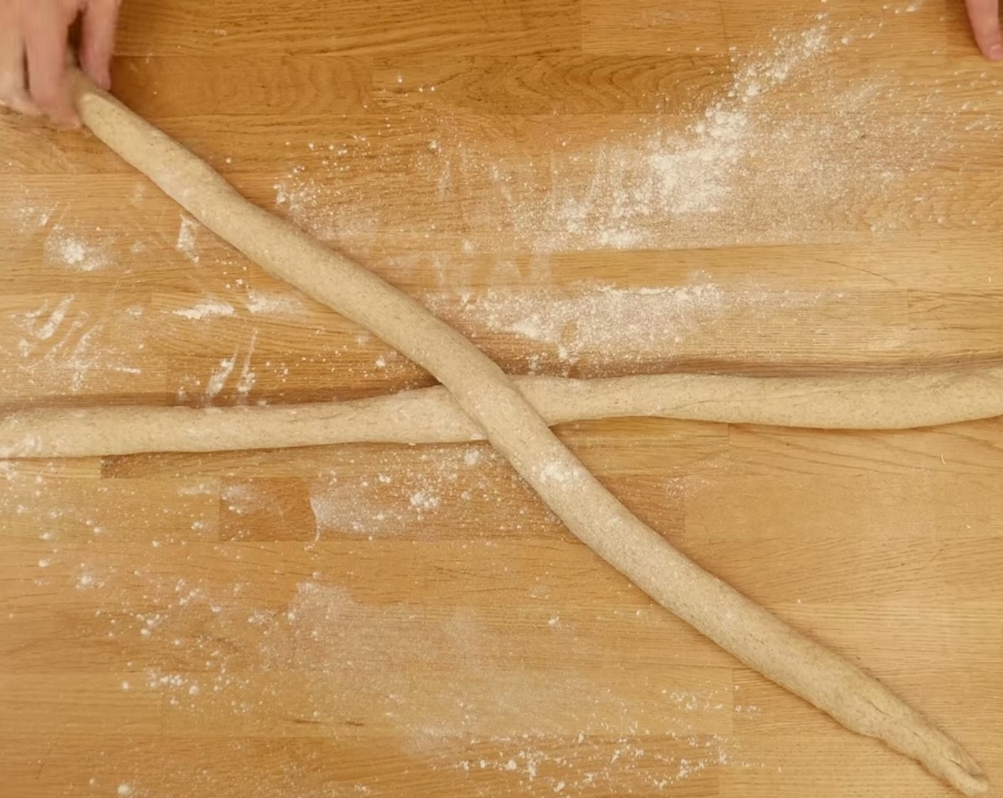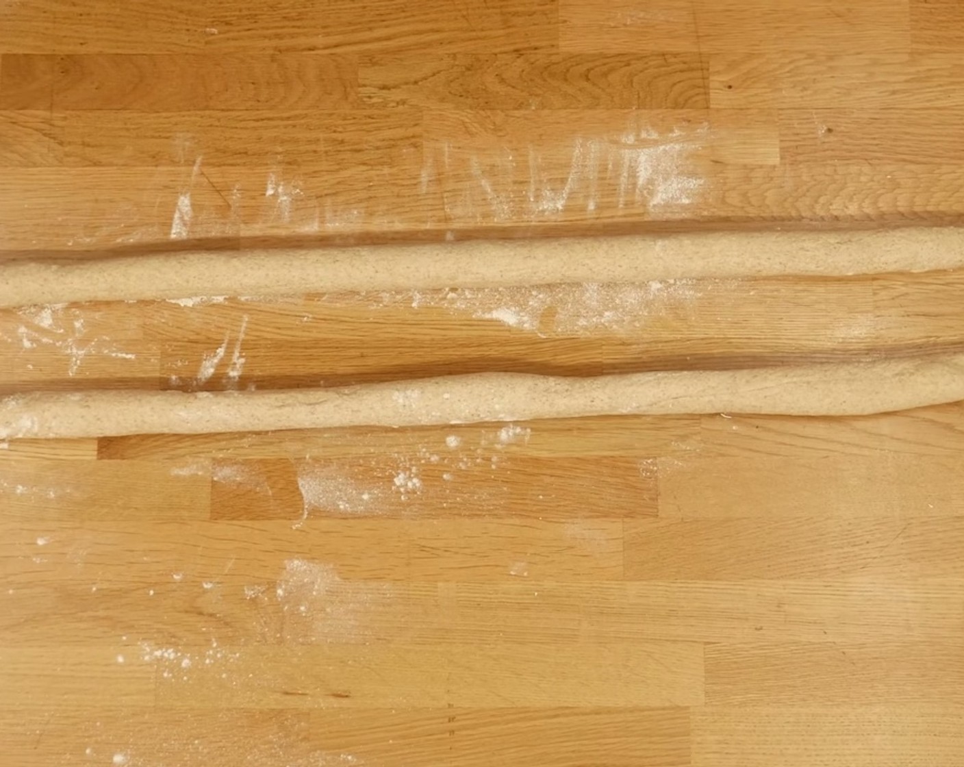 Die Teigstücke länglich zu je einem Strang mit etwa 2-3 cm Durchmesser rollen. Dabei die Stränge zuerst leicht vorrollen, entspannen lassen und erst danach, beginnend mit dem ersten Strang, die Stränge nacheinander in die richtige Länge rollen.