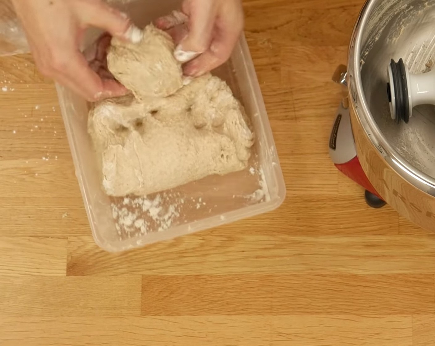 Zwischendurch den Teig 2-3x stretchen und falten in der Schüssel: Hierzu zieht man eine Seite des Teiges leicht hoch und legt den Teig an den gegenüberliegenden Schüsselrand. Dies geht am besten, wenn man die Hände vorher in etwas Wasser tunkt. Diesen Vorgang von allen vier Seiten wiederholen, den Teig wieder zudecken und weiter ruhen lassen.