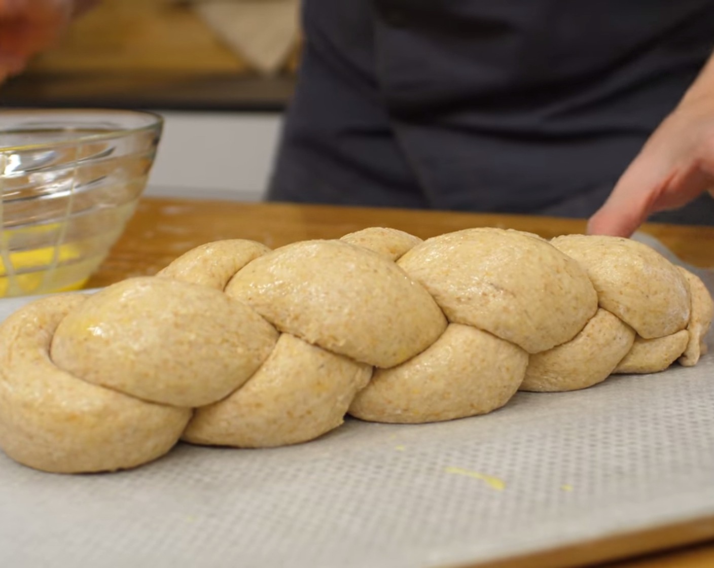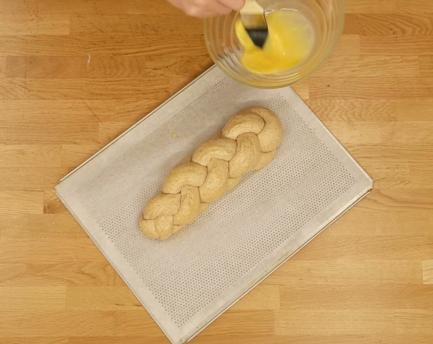 Das Ei (1) in einer Schüssel aufschlagen, mit einem Schwingbesen oder einer Gabel verquirlen. Den Zopf damit bestreichen und für 30 Minuten bei Raumtemperatur gären lassen.