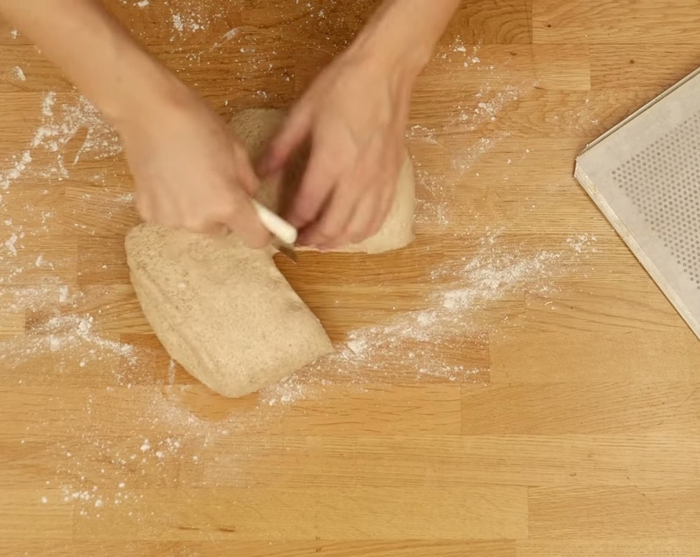 Nach der Gärzeit den Teig auf eine bemehlte (wenig) Arbeitsfläche geben und in zwei gleich grosse Stücke teilen.