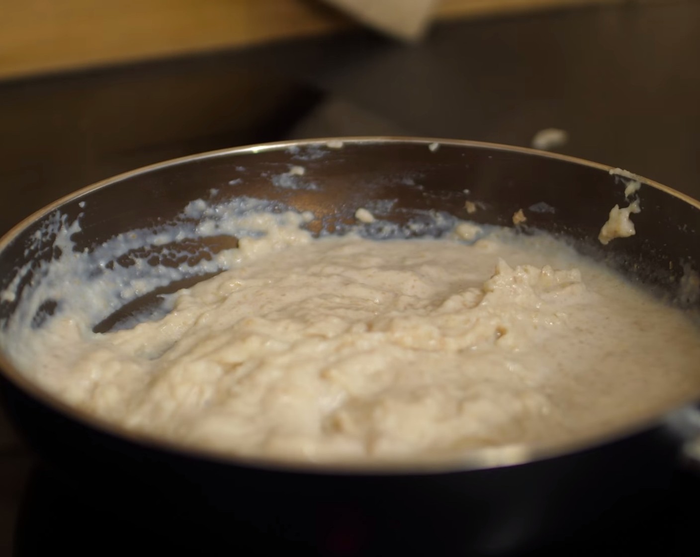 Kochstück: Das Weizen-Vollkornmehl (50 g) mit der Vollmilch (200 g) in einen Kochtopf geben und auf dem Herd unter ständigem Rühren aufkochen.