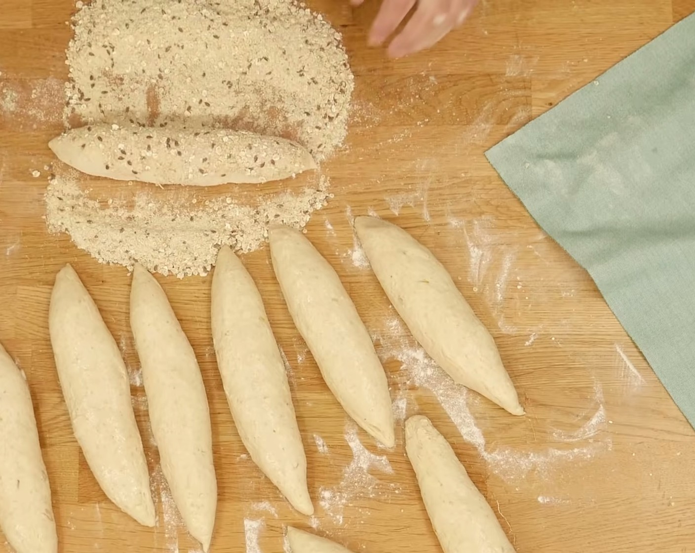 Die vorbereitete Streumischung auf die Arbeitsfläche geben, die Teiglinge mit Wasser (wenig) bepinseln und direkt in der Streumischung wenden.