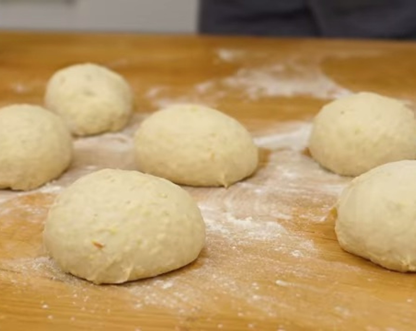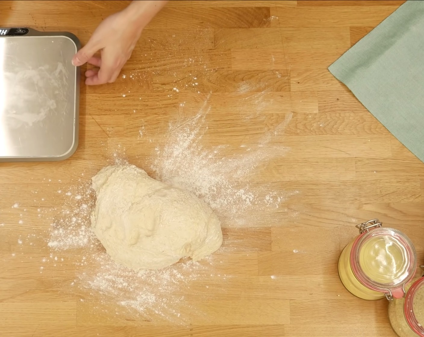 Nach der Gärzeit den Teig auf eine bemehlte Arbeitsfläche stürzen und in Stücke zu 140 g portionieren.
