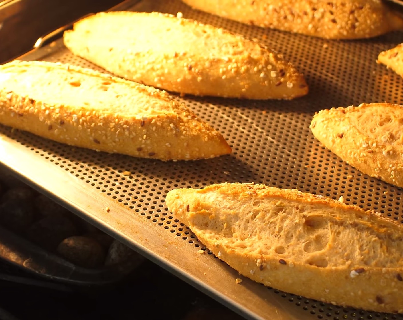 Anschliessend das Blech in die unterste Schiene des Ofens schieben, ein leeres Blech umgekehrt in die oberste Rille schieben und in die feuerfeste Schüssel zirka 1-2 dl Wasser für den Dampf giessen. Die Ofentür schliessen und die Teigstangen für ca. 20 Minuten backen.