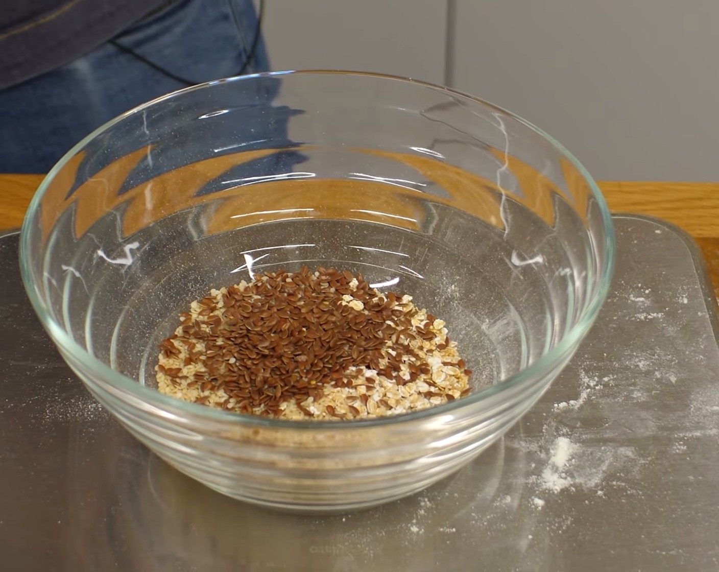 Streumischung: Während der Teig ruht, Weizen-Vollkornmehl (2 Esslöffel), Maisgriess (4 Esslöffel), Quinoa Flocken (1 1/3 Esslöffel), Sesamsamen (1 EL), Leinsamen (1 TL) in eine Schüssel geben, gut vermischen und bis zur Verwendung auf die Seite stellen.