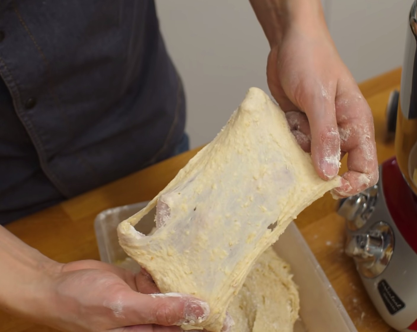 Die Knetgeschwindigkeit erhöhen und den Teig weitere 15-20 Minuten kneten bis er die Fensterprobe besteht.