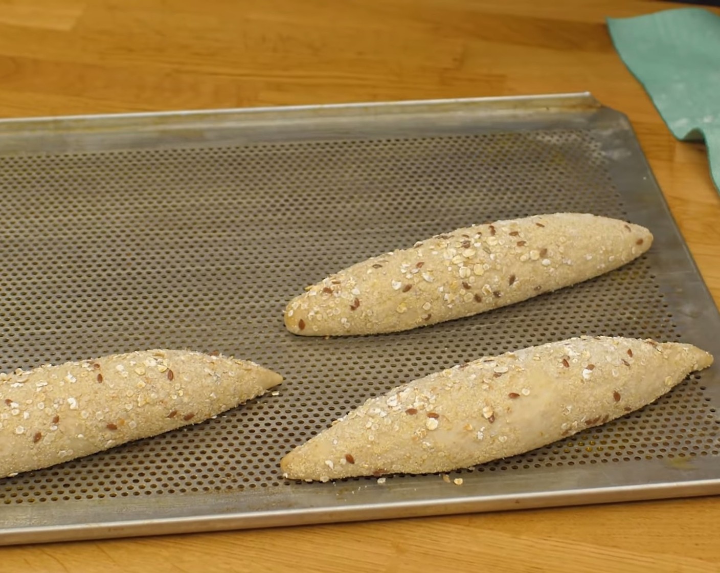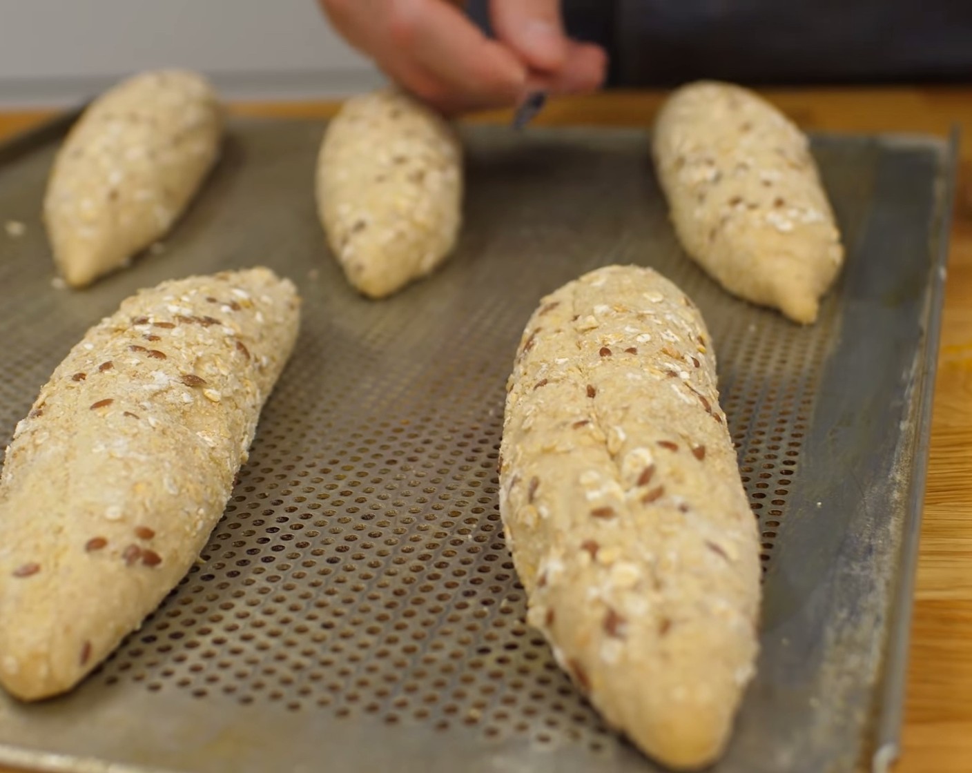 Die Teigoberfläche 1-mal mit einem scharfen Messer (Pariserbrotklinge) länglich einschneiden. Dabei die Klinge in einem 45-Grad-Winkel führen.