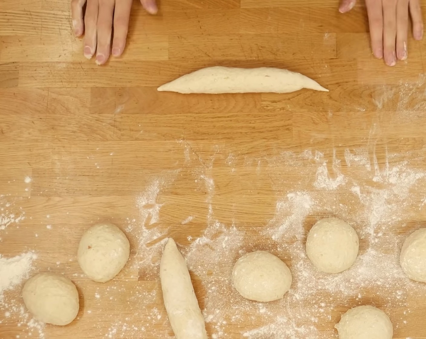 Jedes Teigstück 2-3 Mal über die Arbeitsfläche schleifen, um eine glatte Oberfläche zu bekommen. Anschliessend die Teiglinge leicht rund formen und etwas bemehlen.