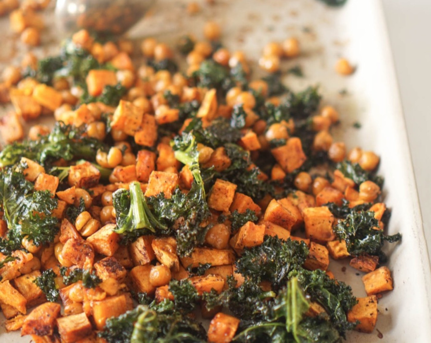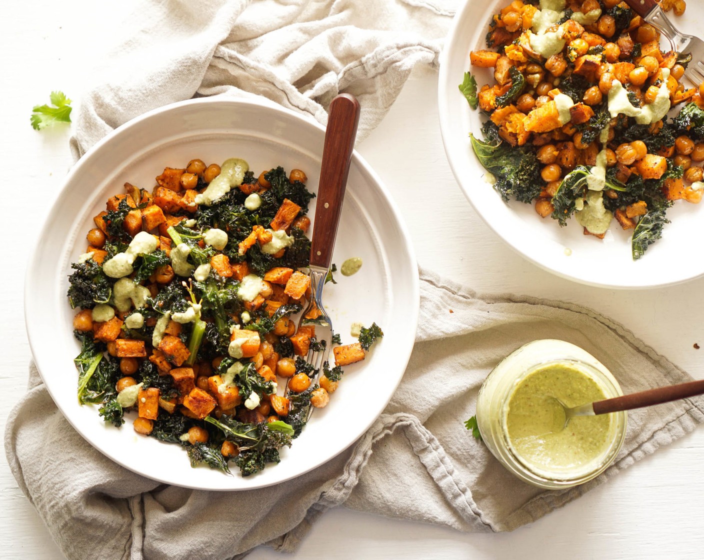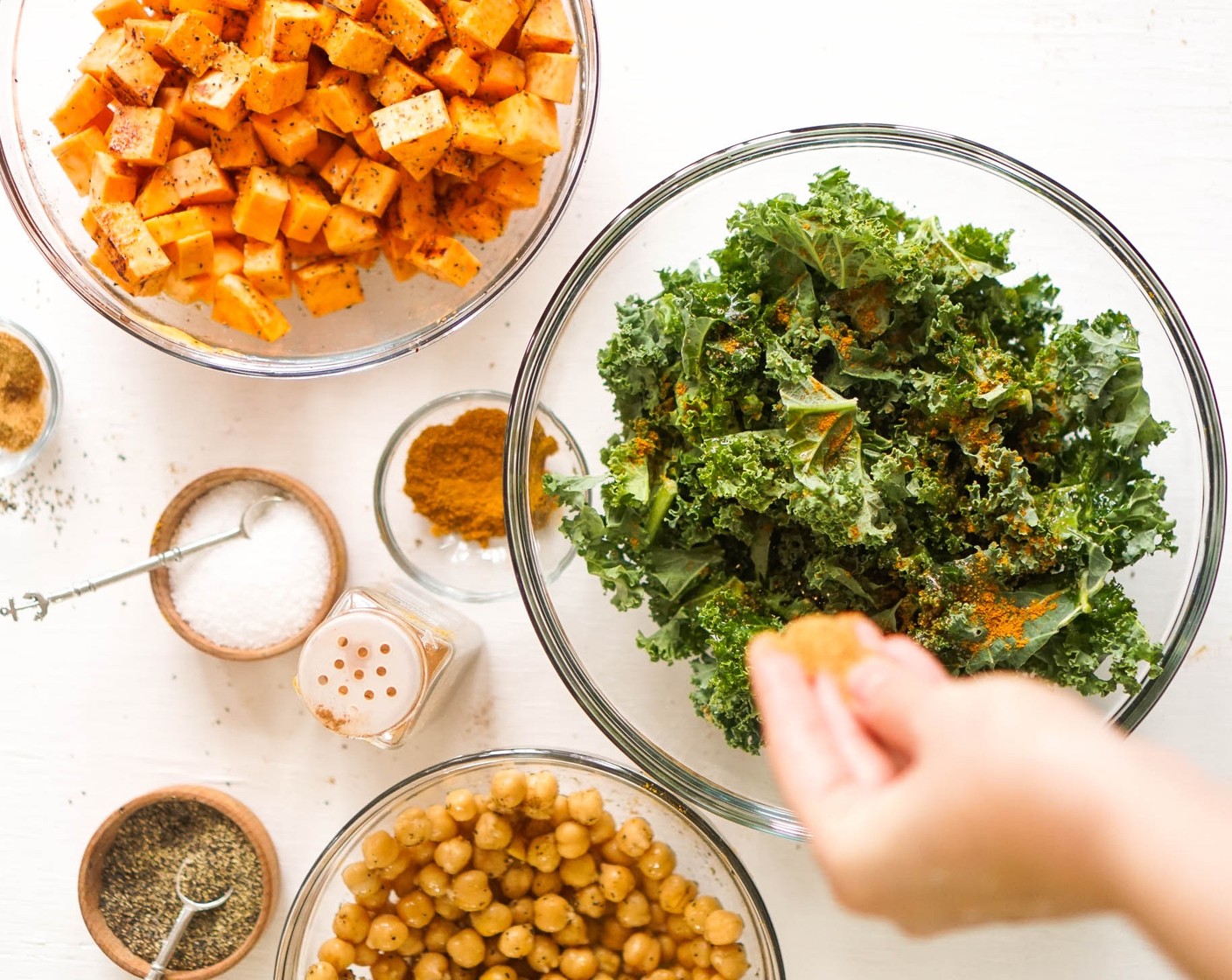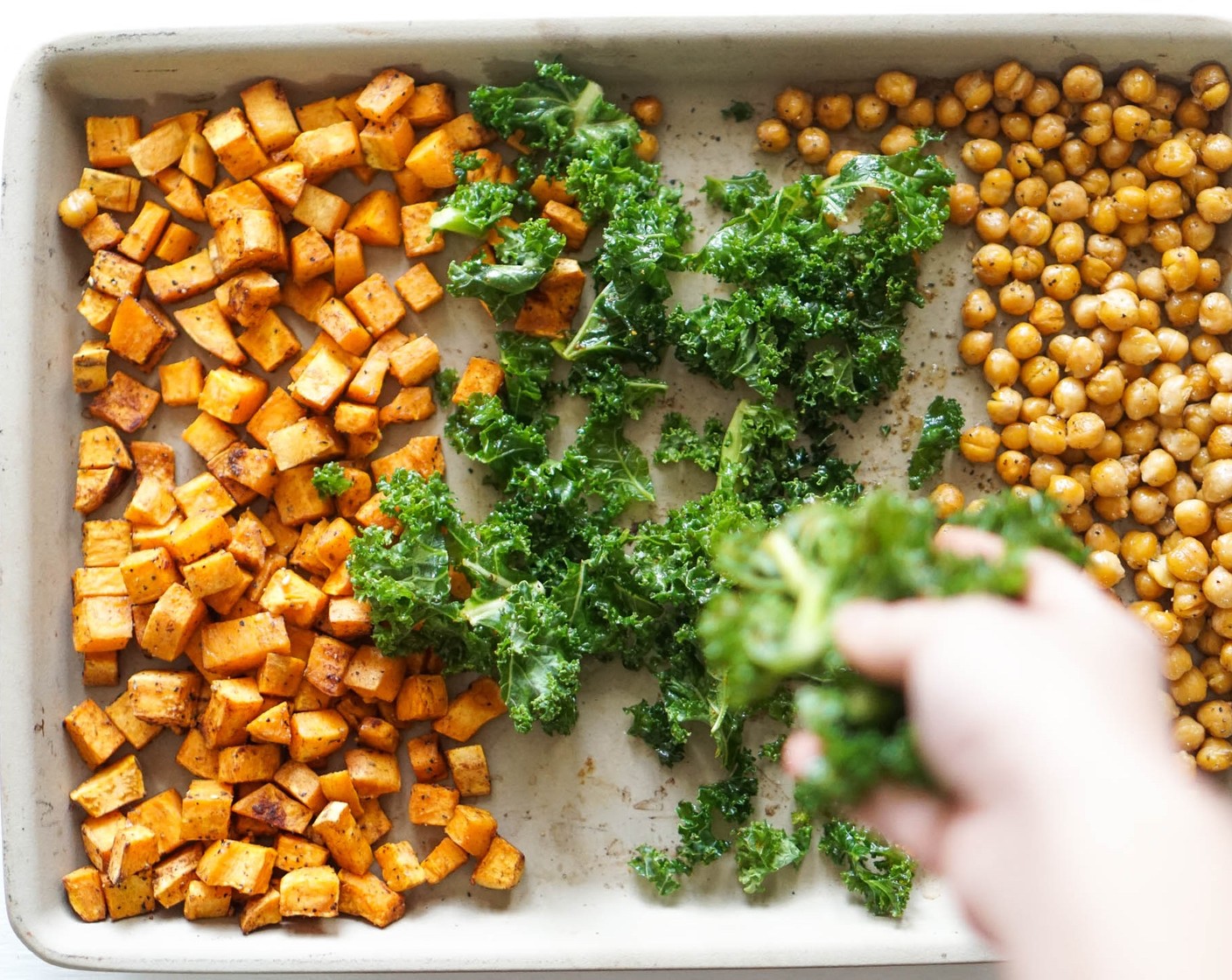 Du wirst feststellen, dass die Kartoffeln, die Kichererbsen und der Grünkohl alle etwas unterschiedlich gewürzt sind. Ich habe den Süsskartoffeln einen Hauch von Zimt hinzugefügt, weil Zimt ihnen so eine wunderbare Wärme verleiht. Die Kichererbsen sind hauptsächlich mit Za'atar gewürzt, um ihre Nussigkeit zu betonen, während der Grünkohl mein allerliebstes Grünkohlgewürz hat. Wenn du noch nie Grünkohlchips mit Curry und Zucker probiert hast, dann hast du definitiv etwas verpasst. Genau wie jedes Gemüse oder Getreide seine eigene, einzigartige Textur hat, hat es auch seinen eigenen Geschmack, und die Kombination ist einfach göttlich.