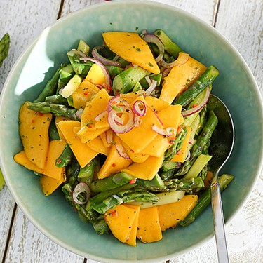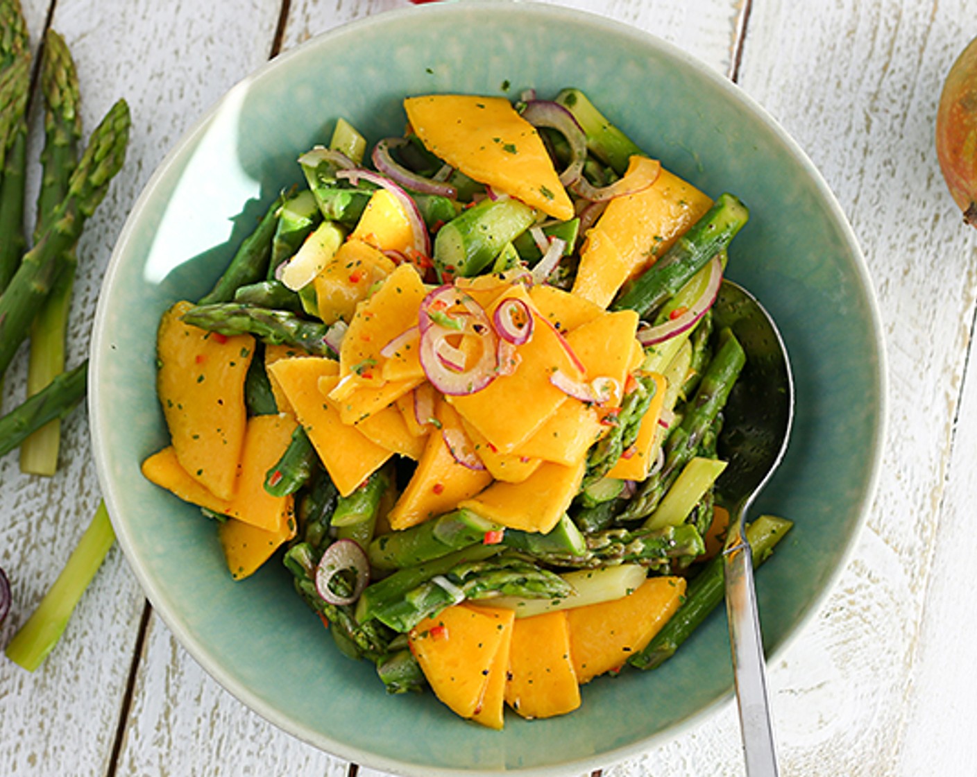 Spargel + Mango = Frühling. Eine interessante Alternative für all diejenigen, die Mango nicht nur als Hauptdarstellerin in süssen Nachspeisen mögen. Ein pfiffiger Frühlingssalat mit einem Limetten-Dressing und einem Hauch von Chili.