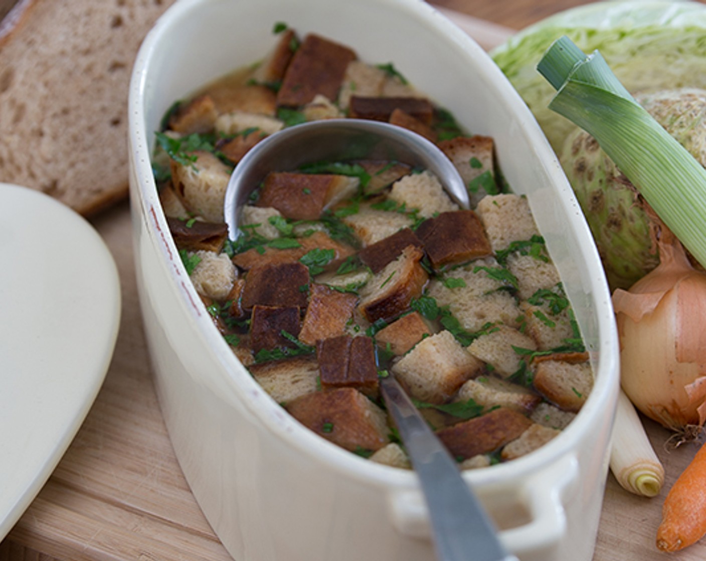 Wer kennt es nicht, man geniesst am Sonntag einen ausgiebigen Sonntagsbrunch und am Ende sind Brotresten übrig. Klar schmeckt frisches Brot am besten, aber auch wenn es alt und trocken ist, taugt es zu mehr als Entenfutter. Es ist ein Rohstoff für einfache, schmackhafte Gerichte oder Toppings auf dem Salat, wie z. B. Goldbraun angebratene Brot-Croûtons. Doch das ist längst nicht alles, was man mit Brotresten anstellen kann. Wie wäre es, gerade jetzt in der kalten Jahreszeit, mit einer nahrhaften und wärmenden Brotsuppe?