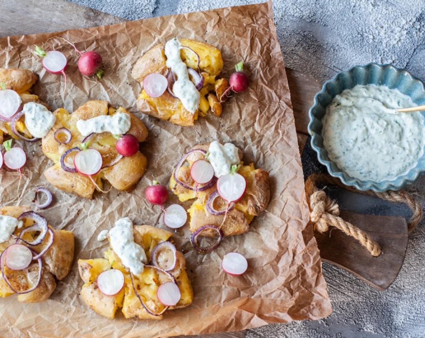 Smashed Potatoes - ein leckerleichtes, vegetarisches Menü, welches sich gut vorbereiten lässt. Den Quarkdip würzen wir mit dem Original Herbamare® Meersalz mit Gemüse und Kräutern; dieses Kräutersalz ist frei von Zusatzstoffen aller Art, sowie laktose- und glutenfrei.