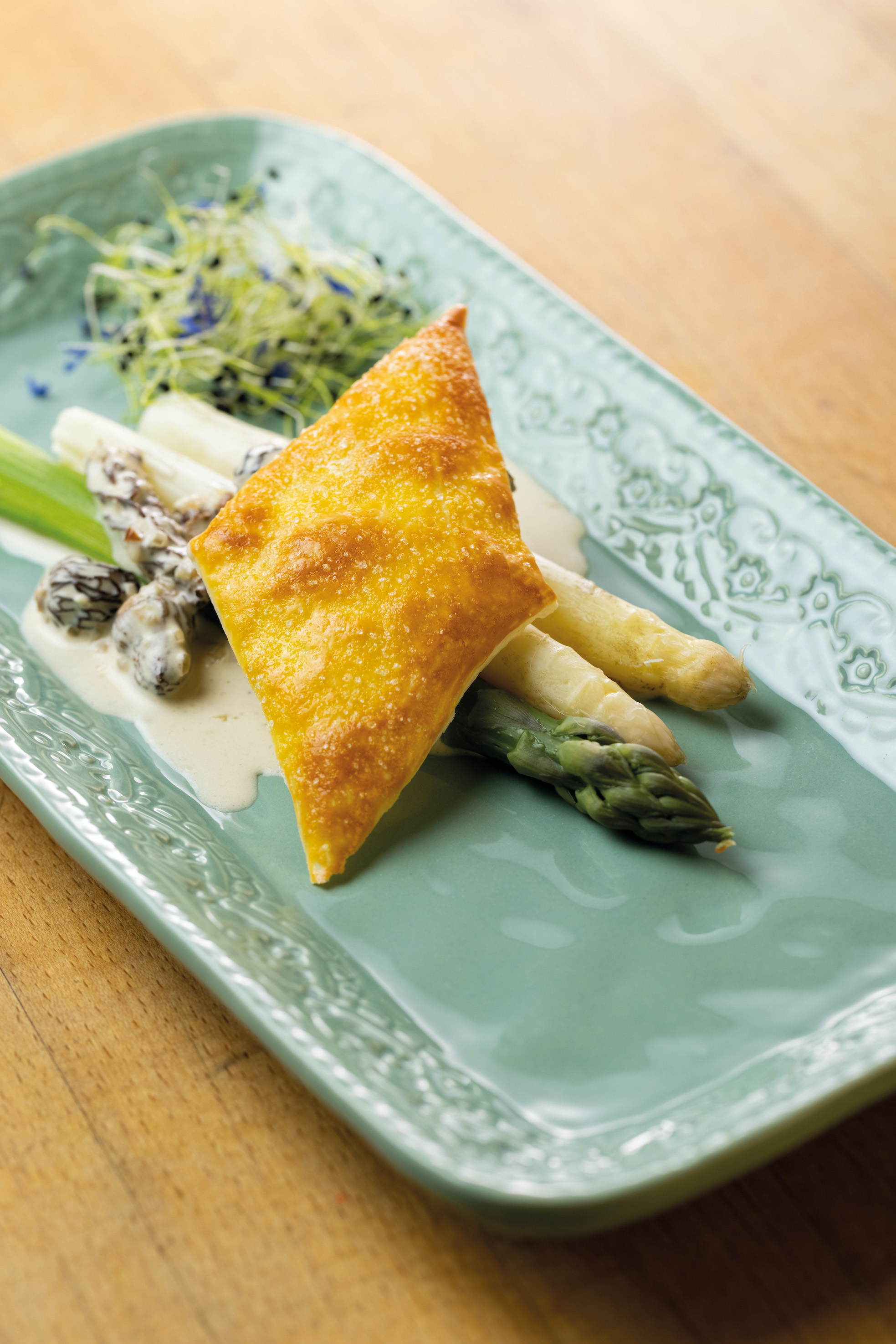 "name": "Blätterteigfeuilletes mit Morcheln und Spargeln",