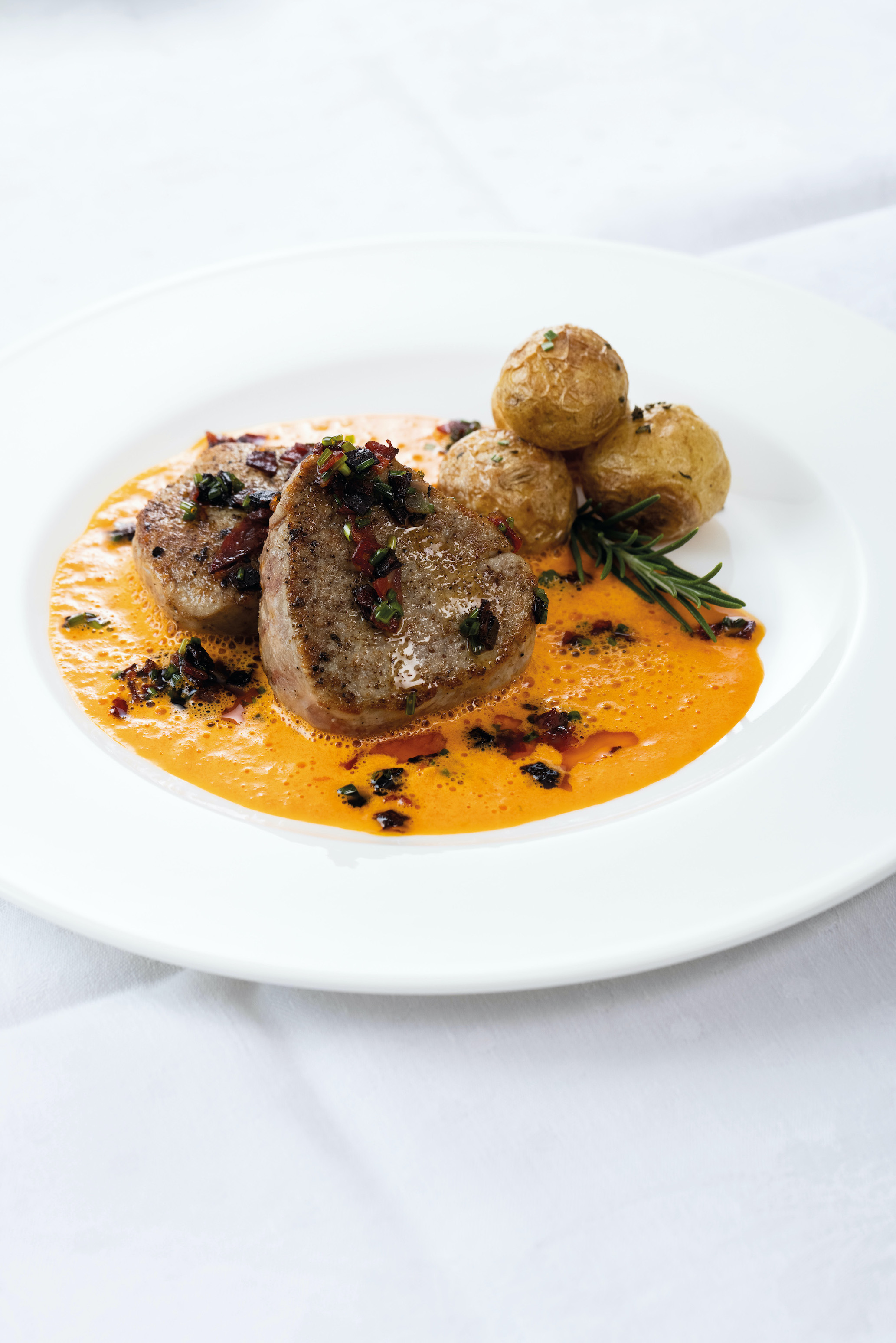 "name": "Kalbsfiletmedaillons mit Peperonischaumsauce und Chorizo",