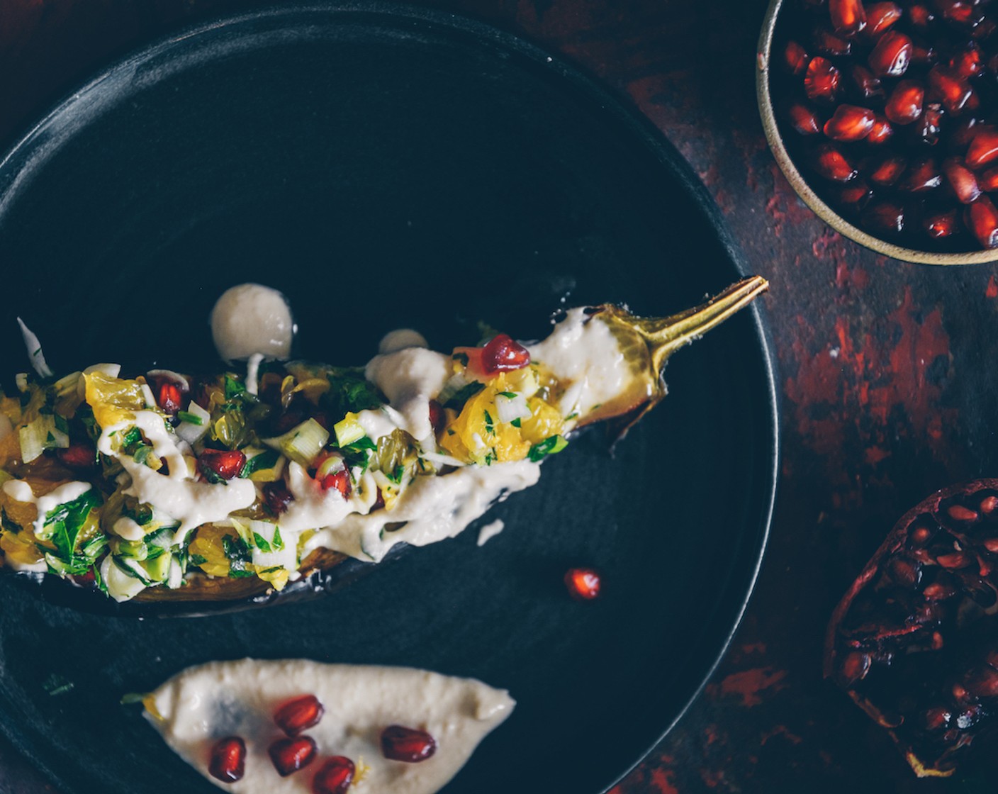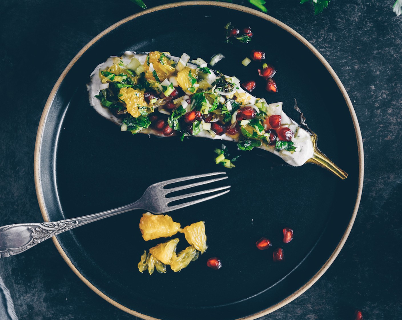 Gebackene Aubergine mit Granatapfel und Orangen Topping