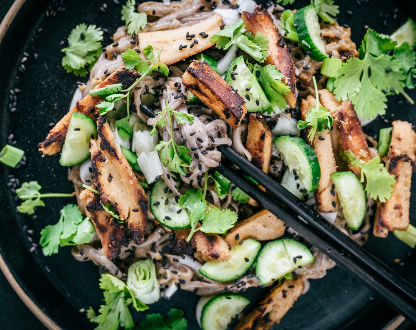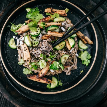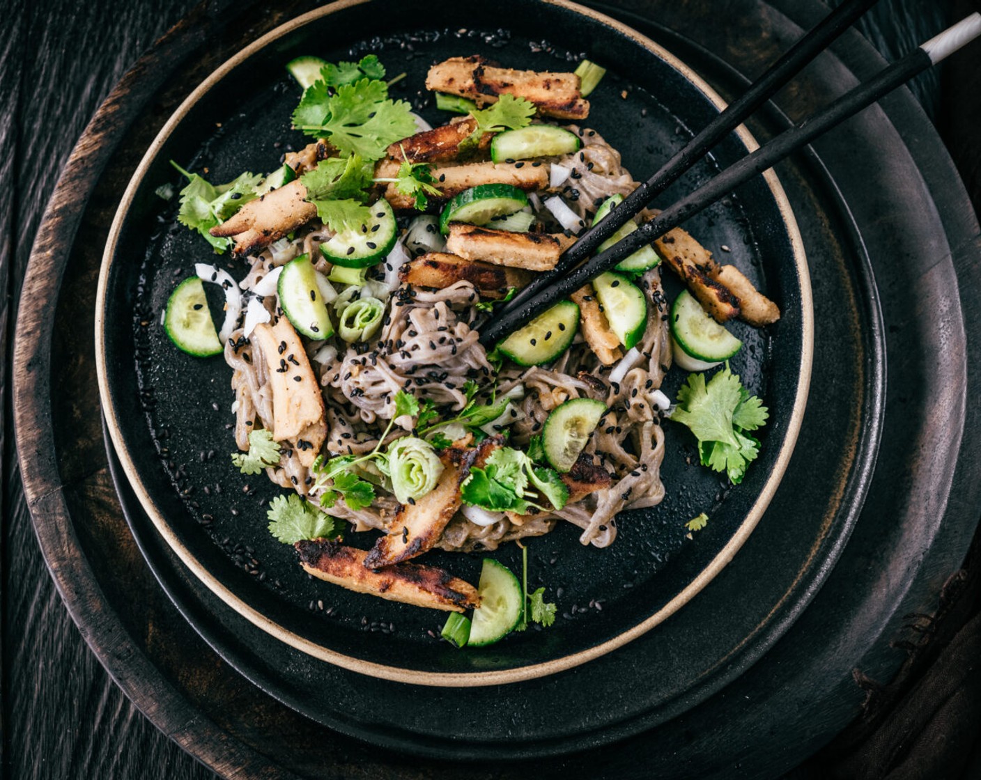 Soba Nudeln werden in der Japanischen Küche verwendet. Sie bestehen aus Buchweizenmehl und liefern nicht nur Energie, sie sind auch glutenfrei! Sie eigenen sich wie auch Reisnudeln sehr gut zum kalt essen. Ich serviere sie an einer cremigen Sauce aus veganer Butter, Misopaste und Tahini. Dazu kombiniere ich knusprig gebratenes Poulet, Frühlingszwiebeln und Gurken.