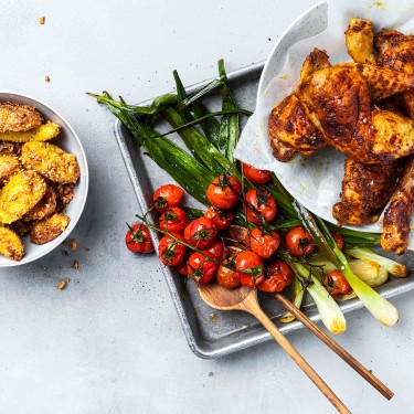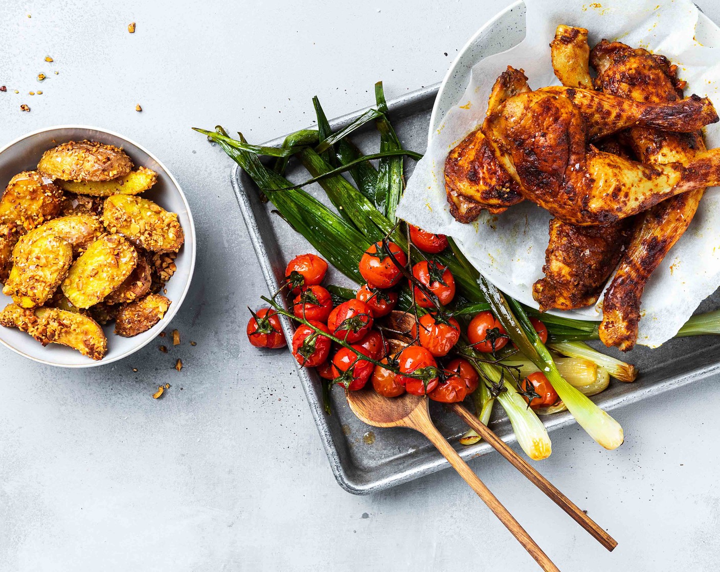 Gebratenes Poulet mit Sesam-Nusskartoffeln und Tomaten