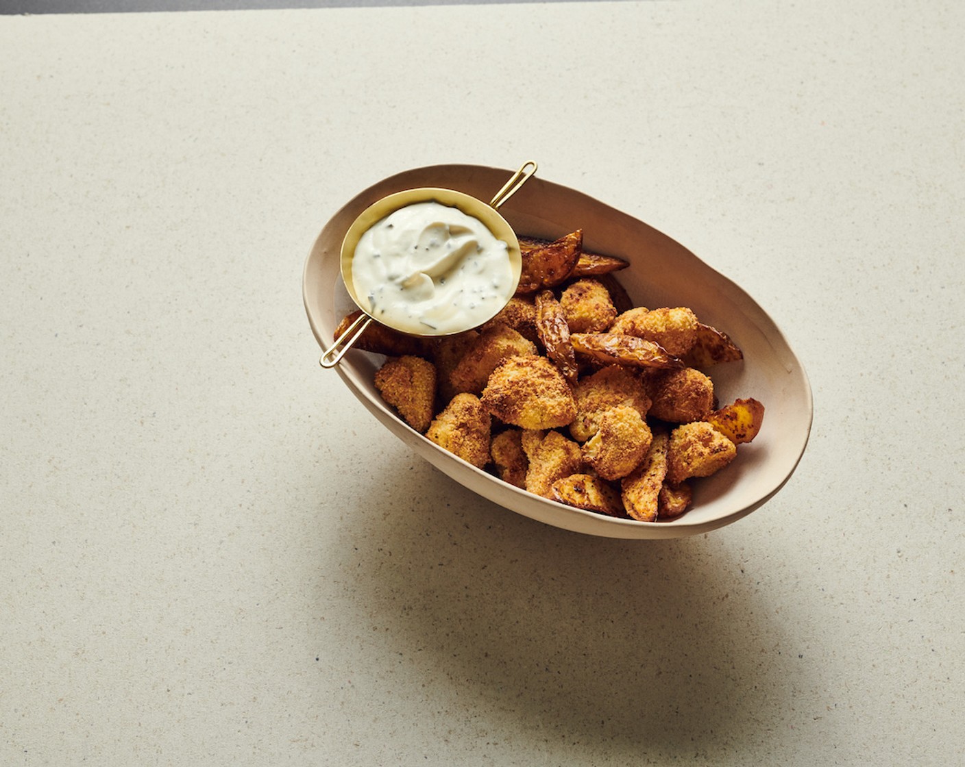 Nuggets mit Kartoffelschnitzen und Trüffel-Mayonnaise.