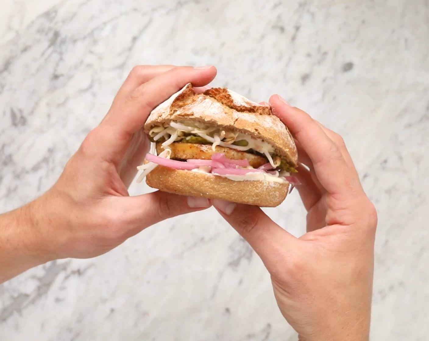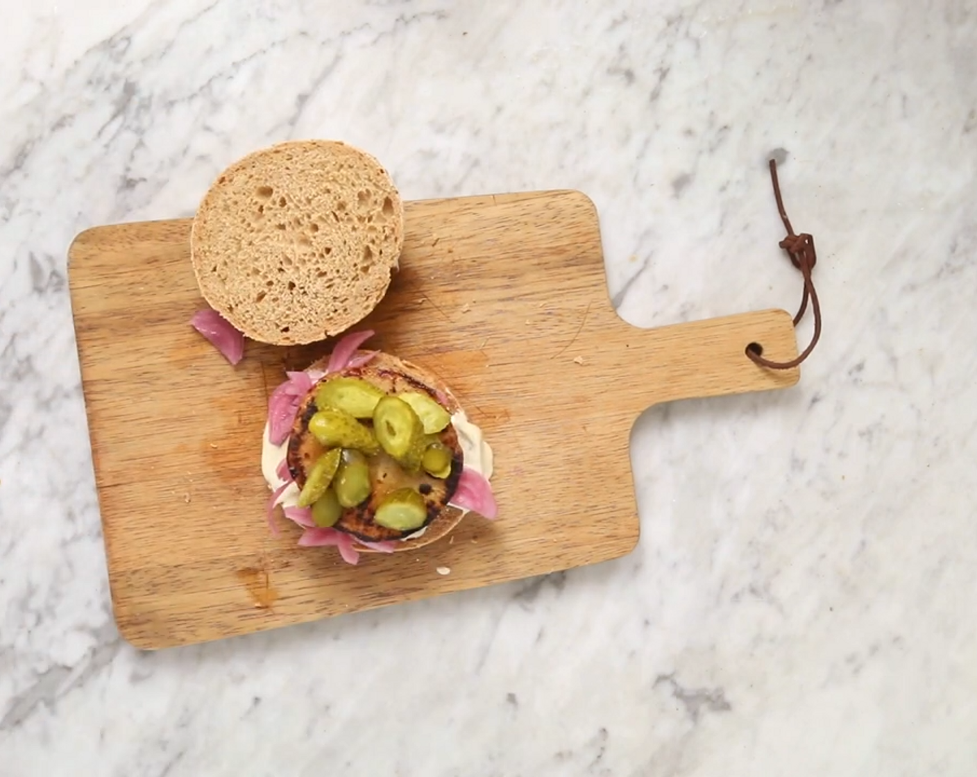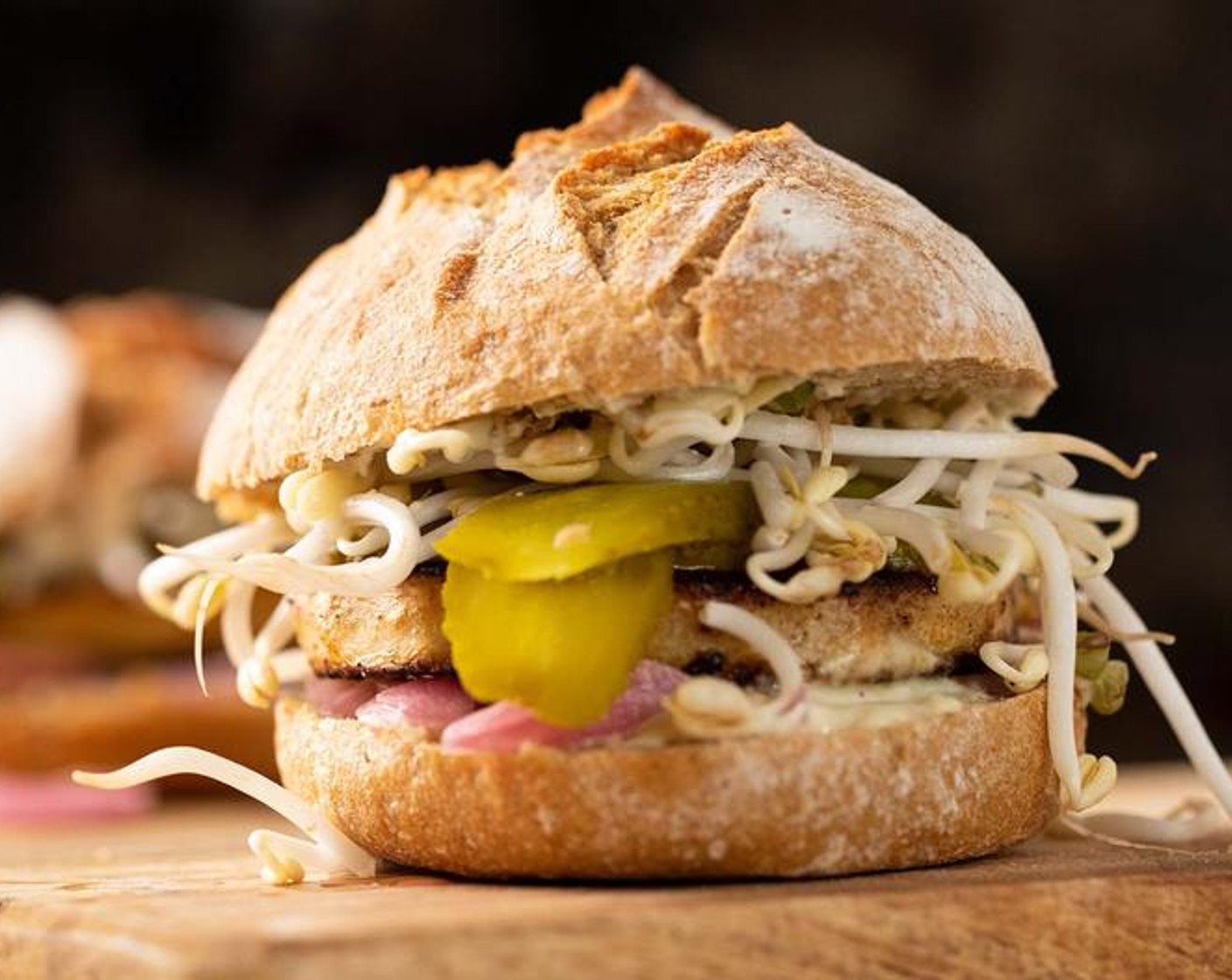 Ein knackiges, saftiges Sellerie-Steak in einem Burger. Die Soja Sauce gibt dem Steak eine etwas knusprige Hülle und die Umami-Geschmacksnote. Dazu eine (mittel-) scharfe Wasabi-Mayo-Sauce, getoppt mit frischen Sojasprossen und eingelegten Zwiebeln.