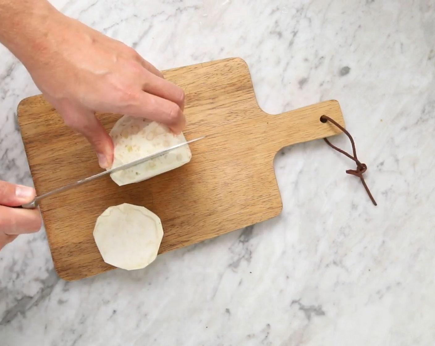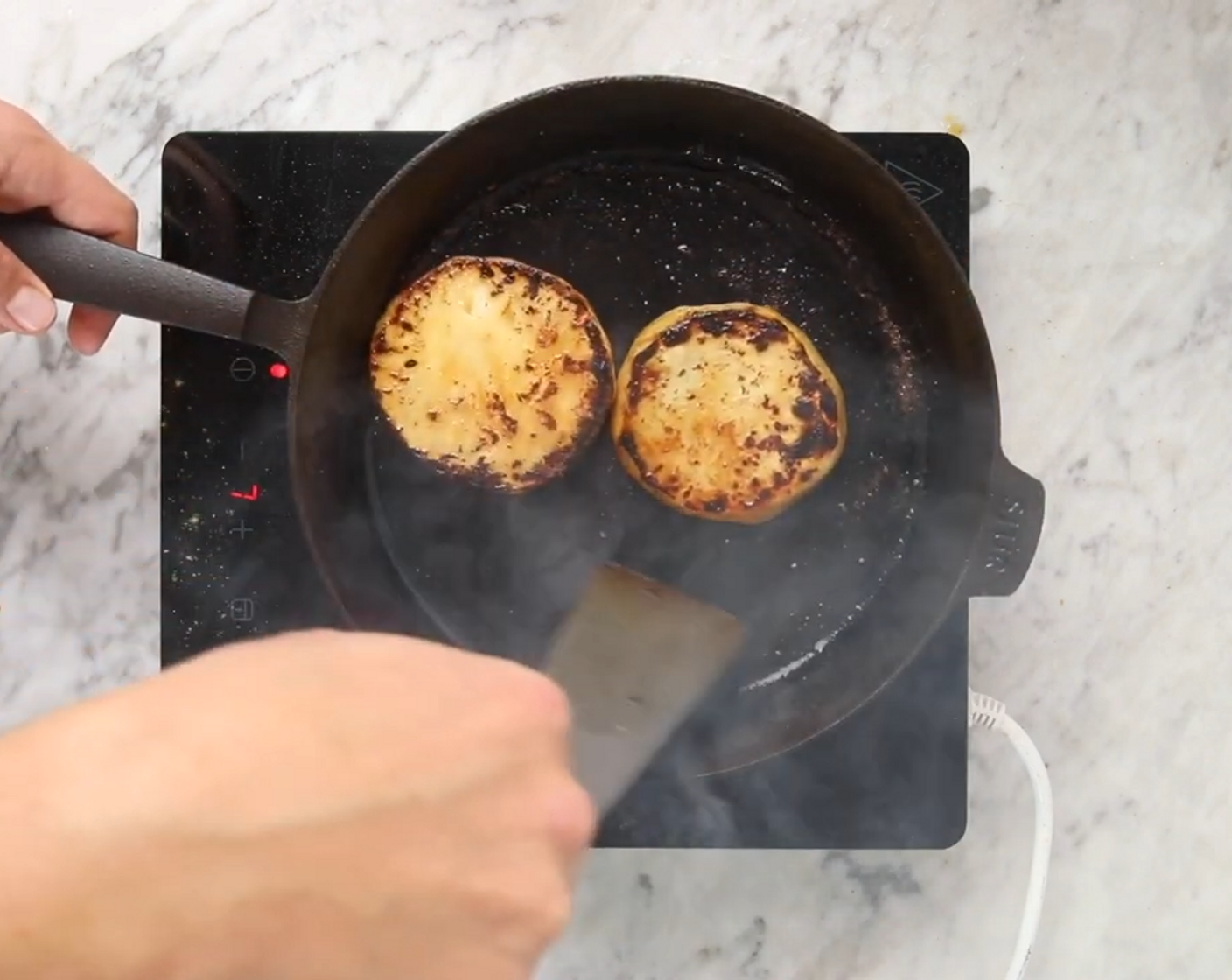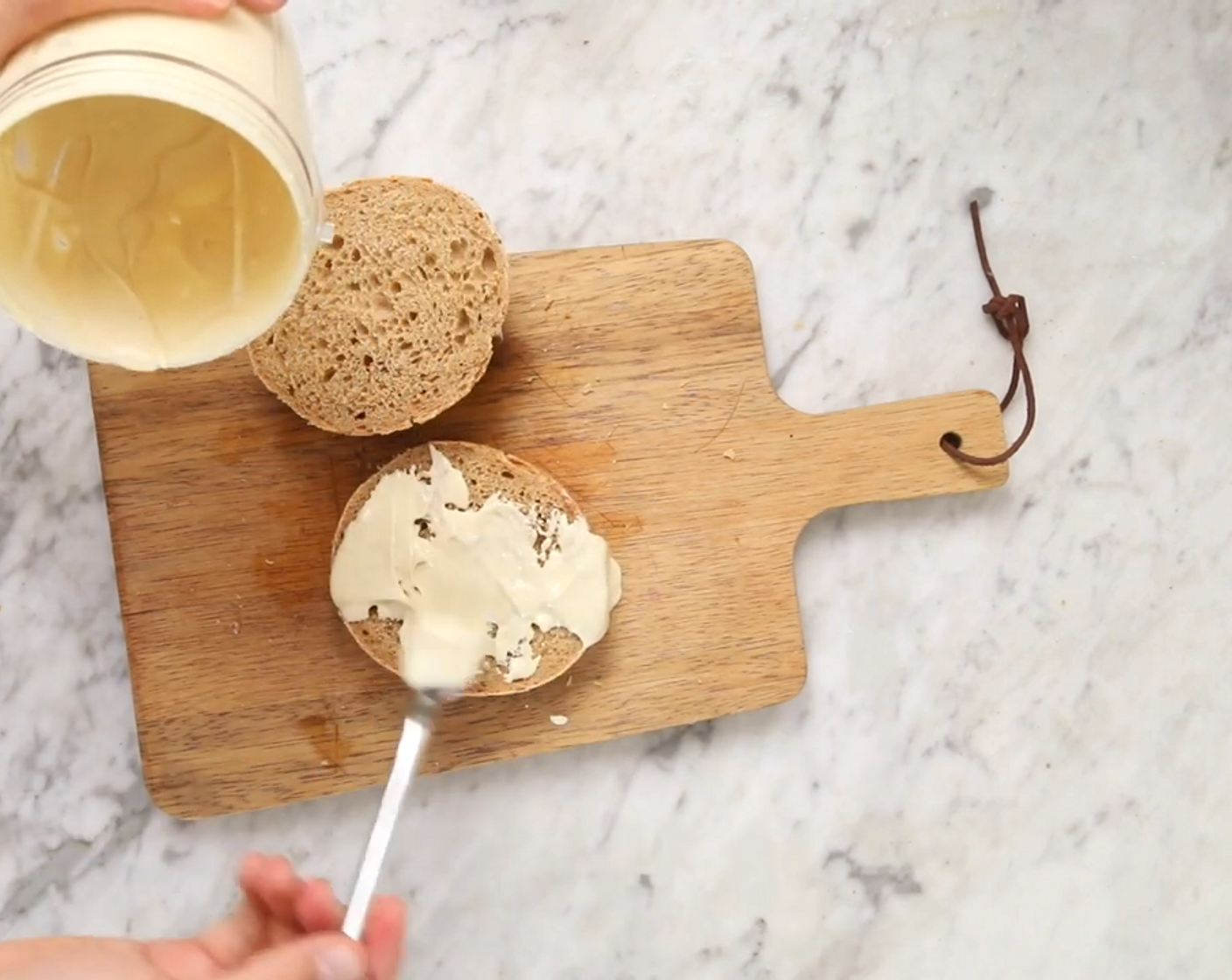 Ein knackiges, saftiges Sellerie-Steak in einem Burger. Die Soja Sauce gibt dem Steak eine etwas knusprige Hülle und die Umami-Geschmacksnote. Dazu eine (mittel-) scharfe Wasabi-Mayo-Sauce, getoppt mit frischen Sojasprossen und eingelegten Zwiebeln.