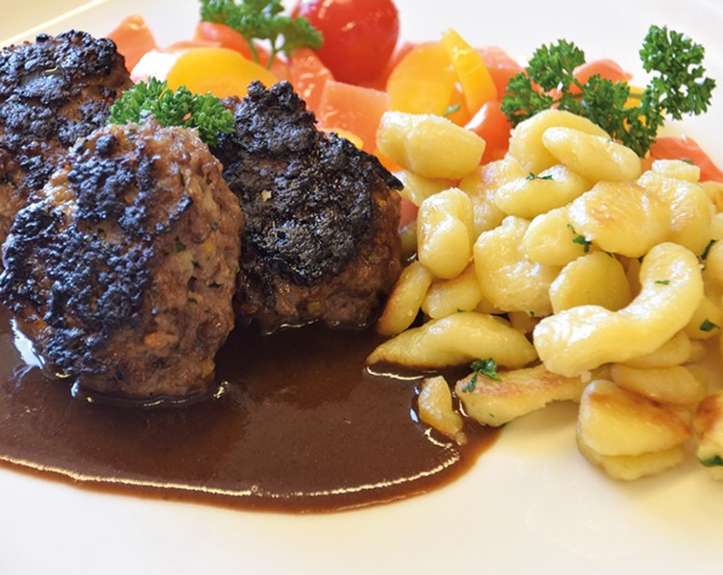 Hacktätschli mit Spätzle an frischen Rüebli