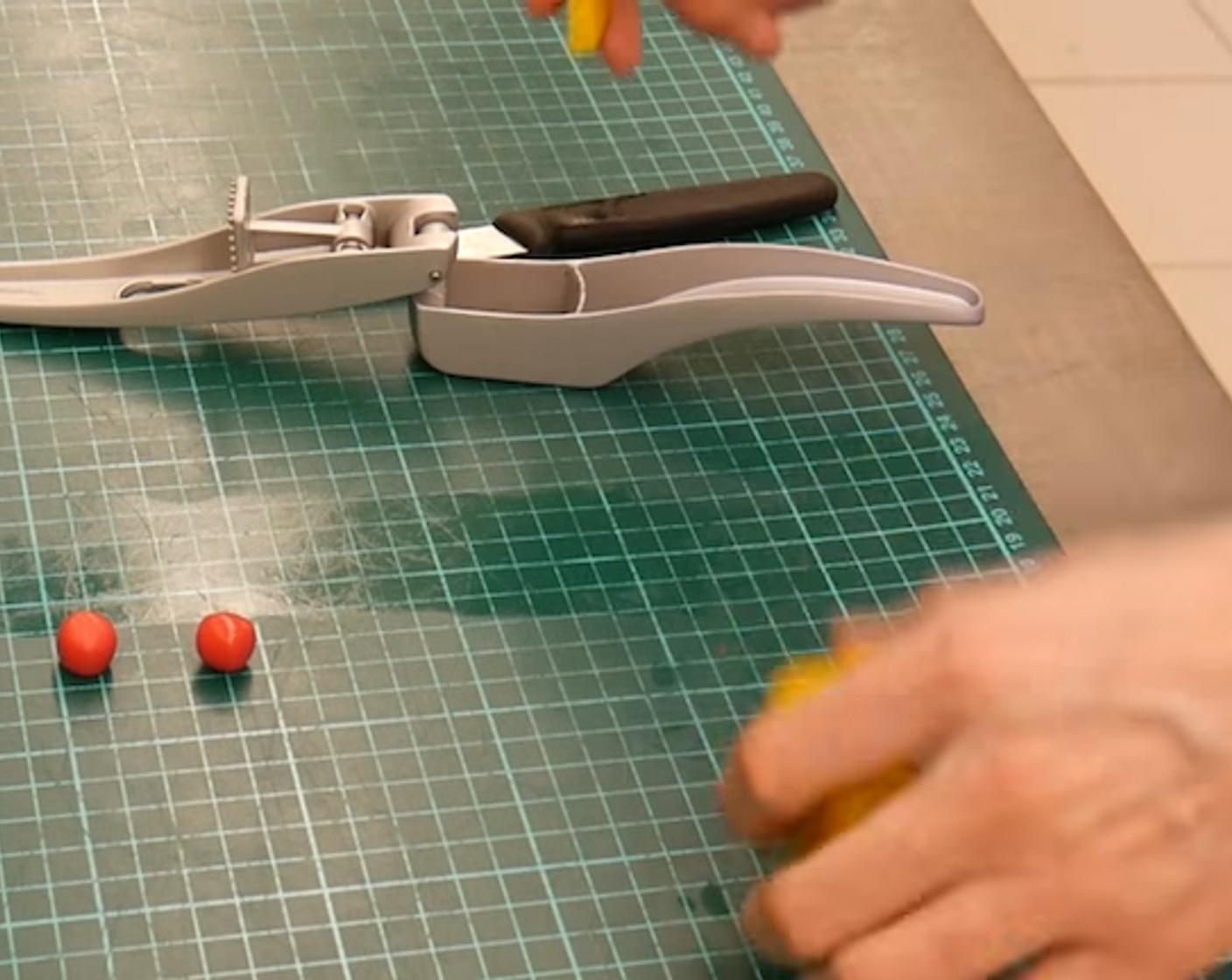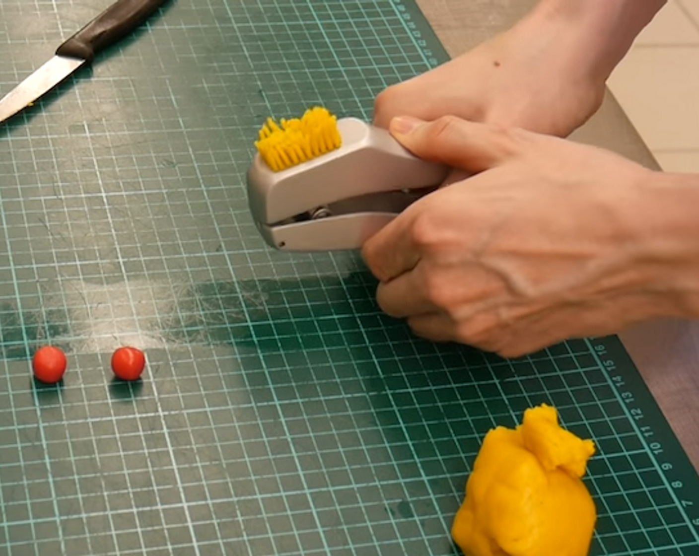 Danach aus einem Stück gelbem Marzipan (1 Rolle) ebenfalls zuerst eine Kugel formen. Diese Kugel durch eine Knoblauchpresse drücken, abschneiden und die Haare sind fertig.