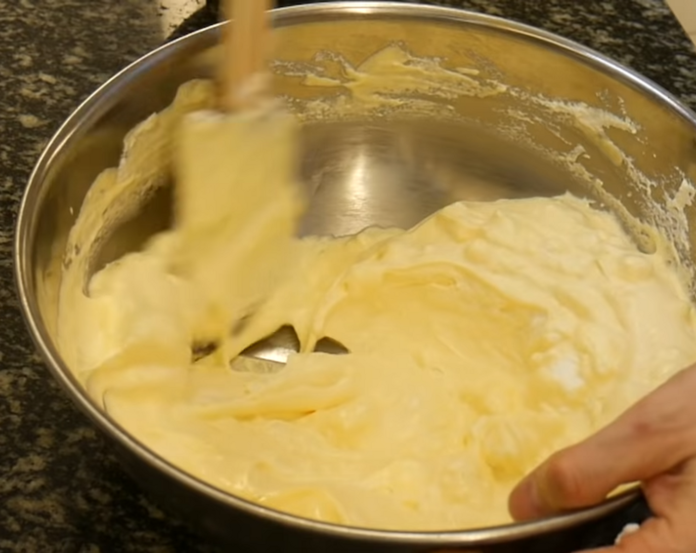 Anschliessend die Eiweissmasse nacheinander vorsichtig unter die Eigelbmasse heben.