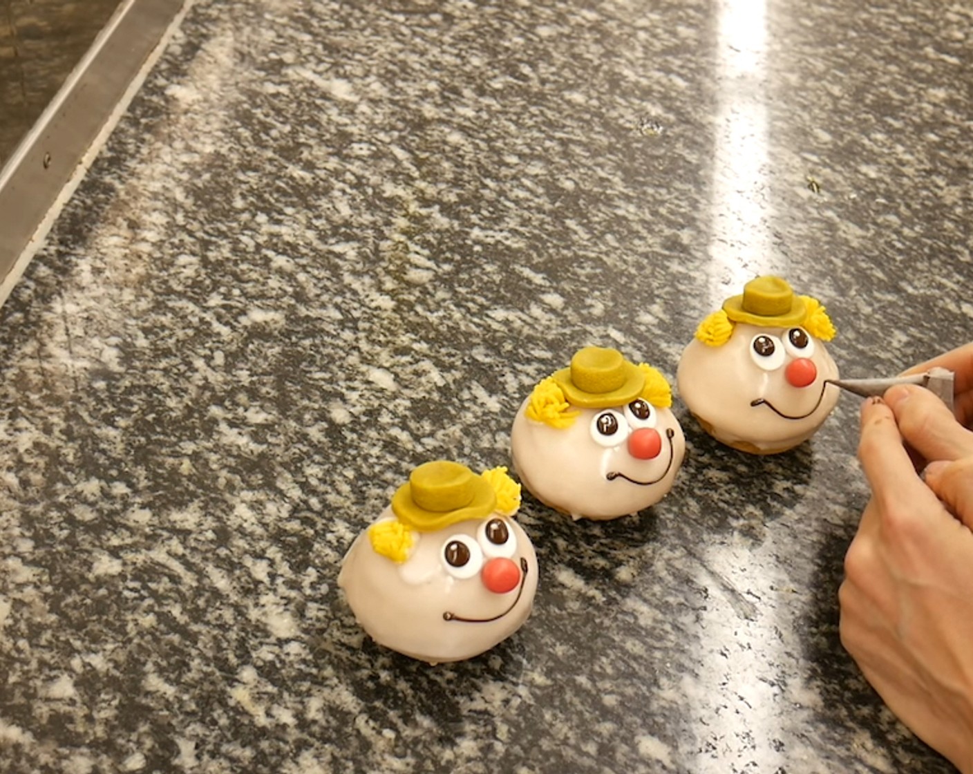 Aus rotem Modelliermarzipan (wenig) kleine Kugeln formen, daraus einen Strang mit ca. 1 cm Durchmesser ausrollen und gleich grosse Stücke schneiden. Aus jedem Stück wieder eine kleine Kugel für die Nase formen.