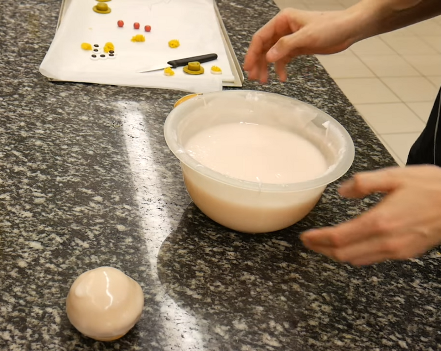 Dann den Fondant (400 g) auf 60 Grad erwärmen. Die Kugeln auf ein Messer stecken, in den flüssigen weissen Fondant tauchen und auf ein mit Backpapier belegte Blech geben.
