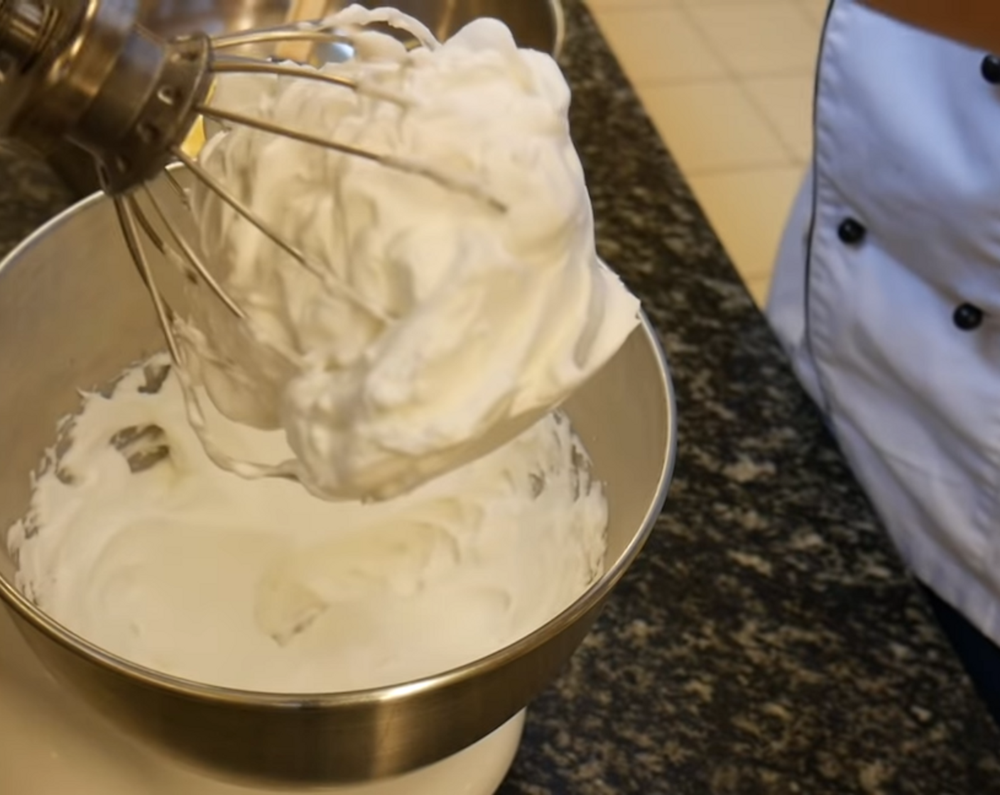 In der Zwischenzeit den Rahm (300 g) steif schlagen. Anschliessend die kalte Vanillecreme nochmals gut durchrühren und vorsichtig die steif geschlagene Sahne unterheben.