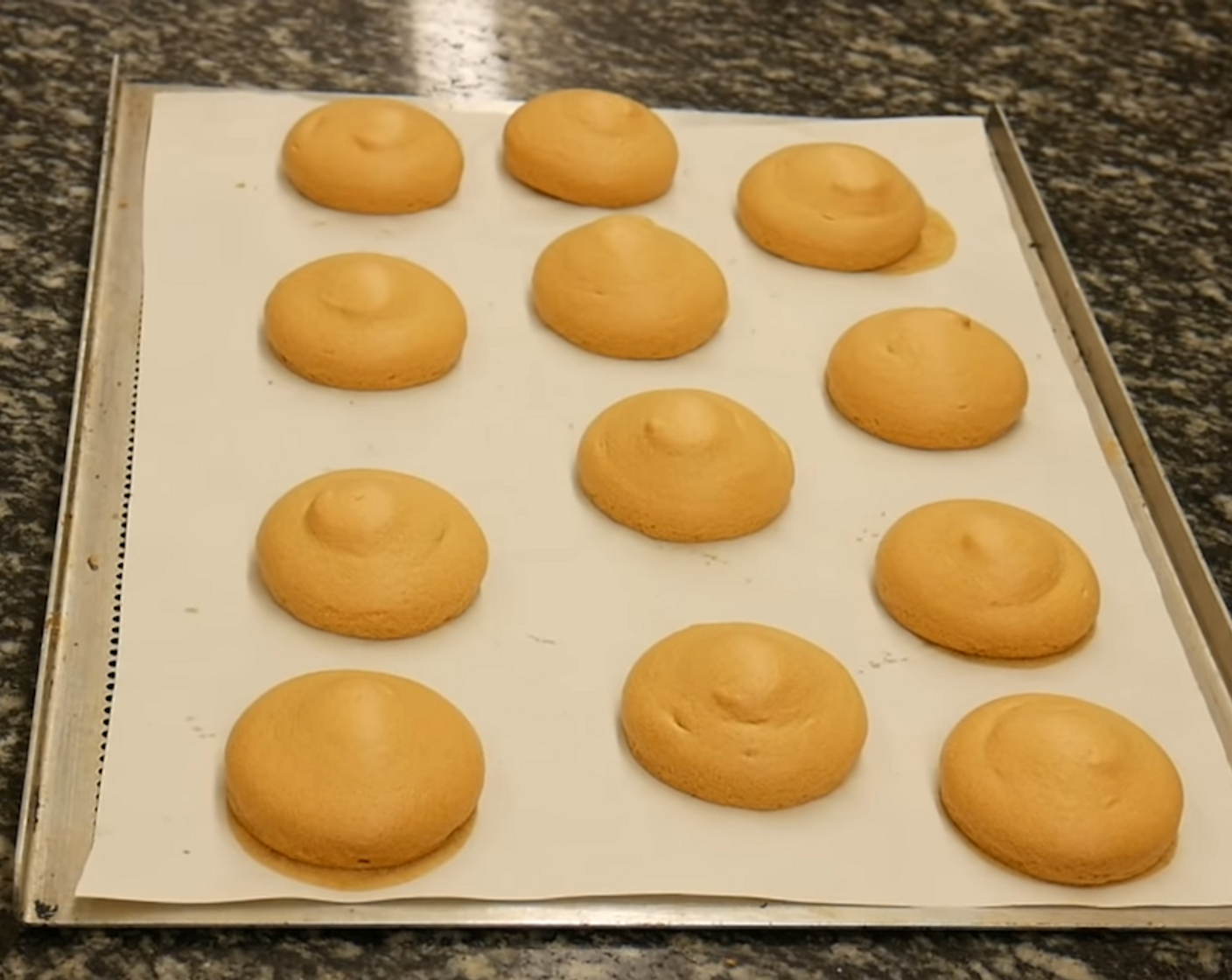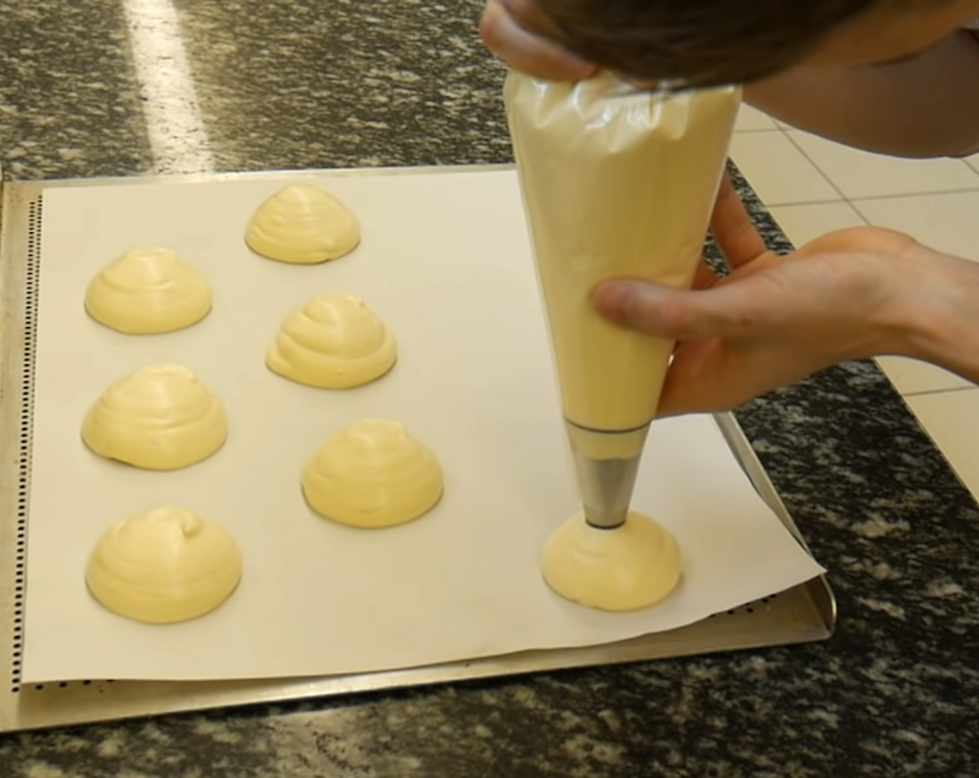 Die Masse in einen Spritzbeutel füllen und mit einer 18-er Tülle Kugeln auf ein Backblech dressieren.