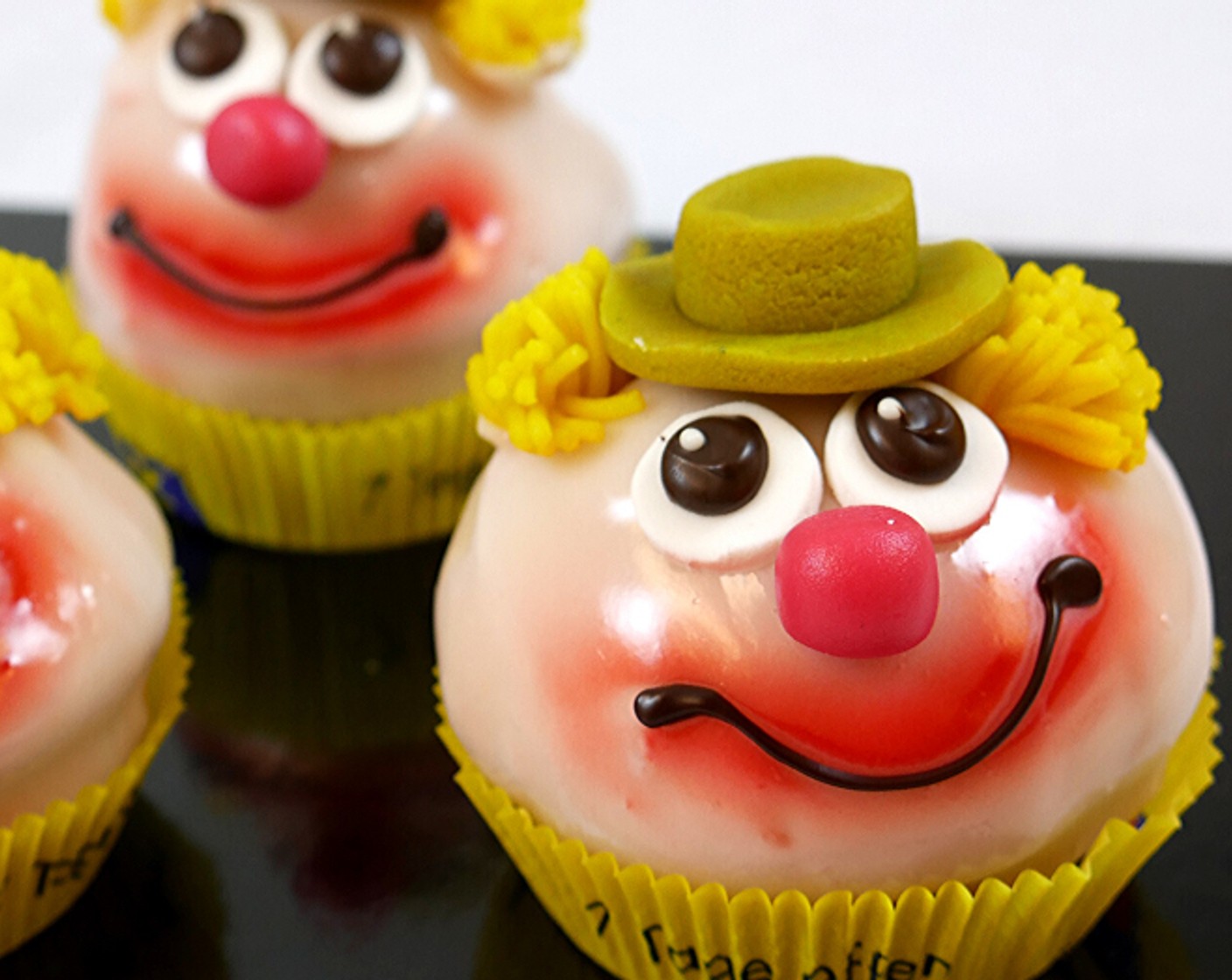 Zum Schluss den weissen Rollfondant (wenig) ausrollen und die Augen mit kleinen Kreisen ausstechen. Mit Schokolade (wenig) die Pupillen in den weissen Augen markieren.
