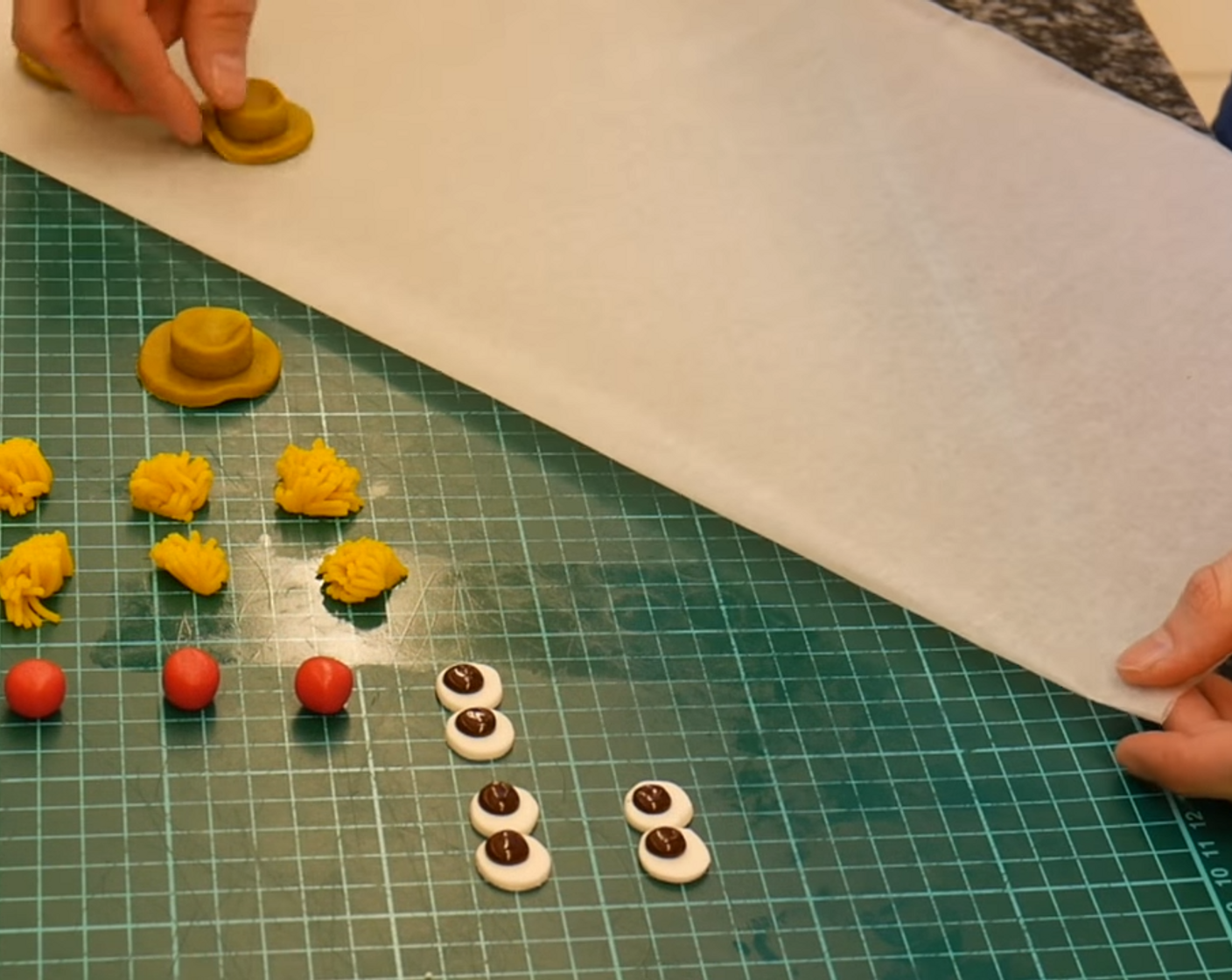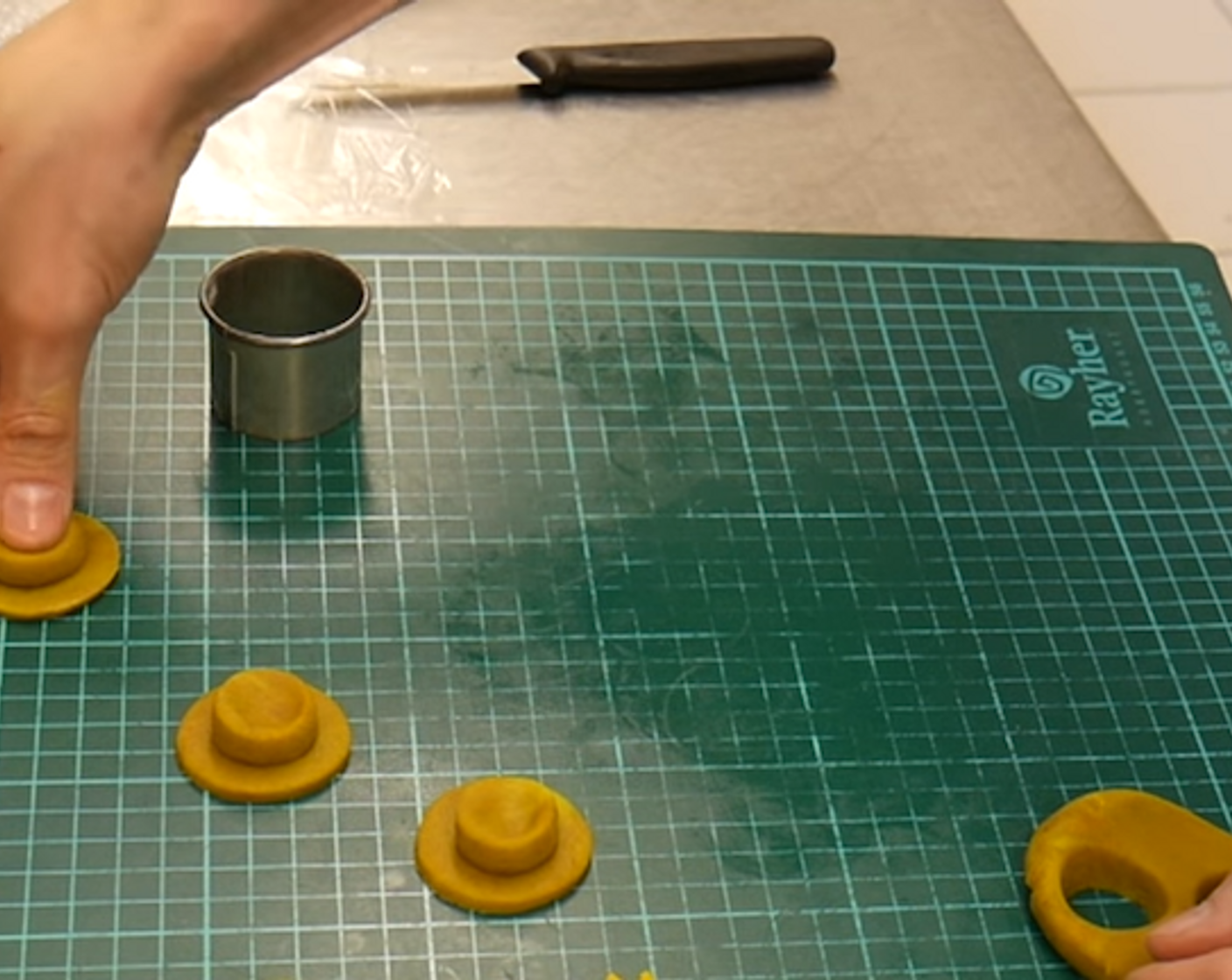 Grünen Marzipan (1 Rolle) auf etwa 3 mm dünn ausrollen und Kreise mit ca. 2 cm Durchmesser ausstechen. Den Marzipan wieder zusammenkneten und erneut auf ca. 7-10 mm ausrollen. Kreise mit ca. 1 cm Durchmesser ausstechen. Die kleinen Kreise für den Hut mittig auf den grossen Kreis setzen und etwas andrücken. Bei Bedarf die Kanten noch etwas hochziehen.