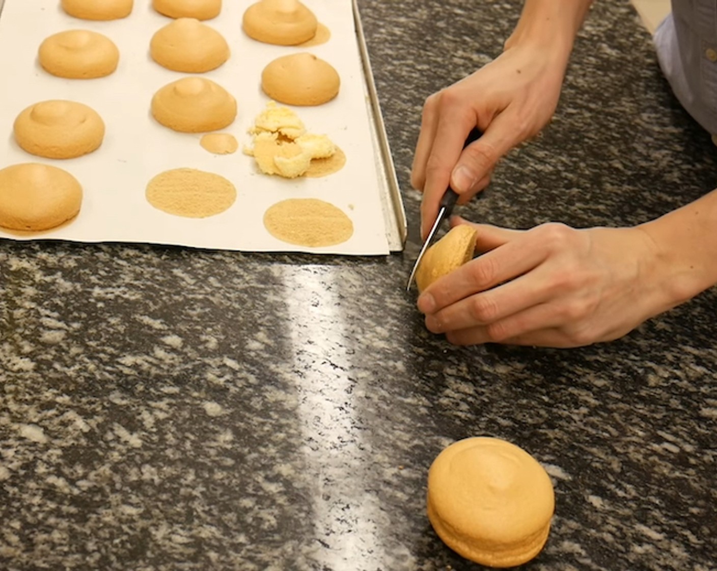 Die ausgekühlten halben Patisserie Kugeln mit einem Löffel aushöhlen, dann eine Hälfte der Kugeln mit einem Messer begradigen, indem der Spitz entfernt wird. Dann mit der Vanillecreme füllen und eine zweite Halbkugel aufsetzen.