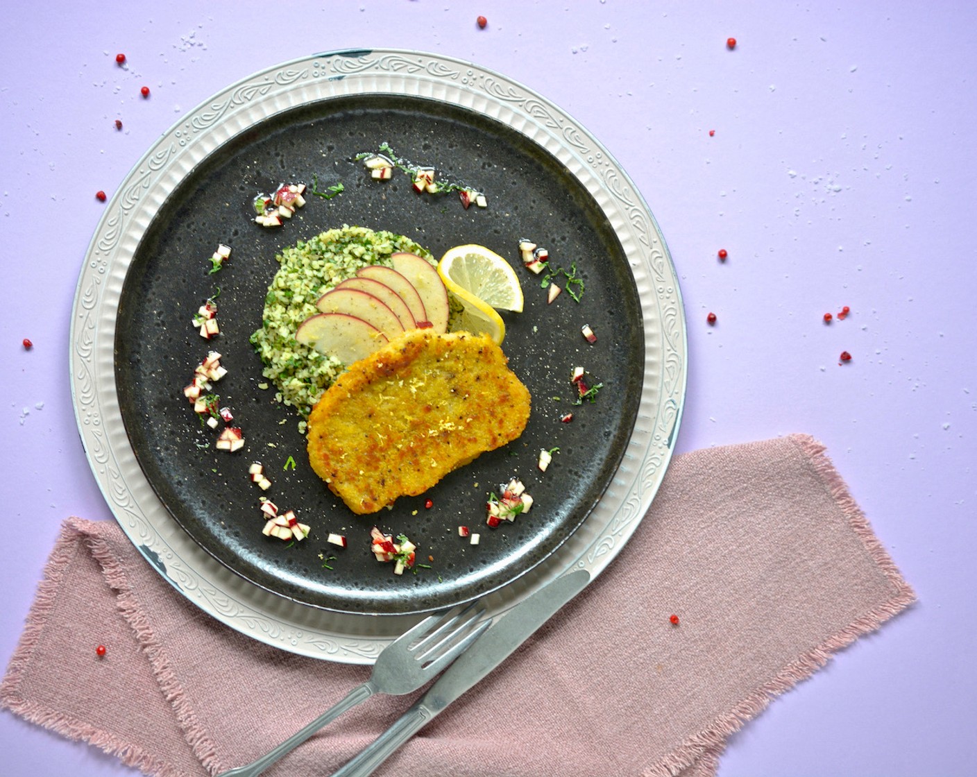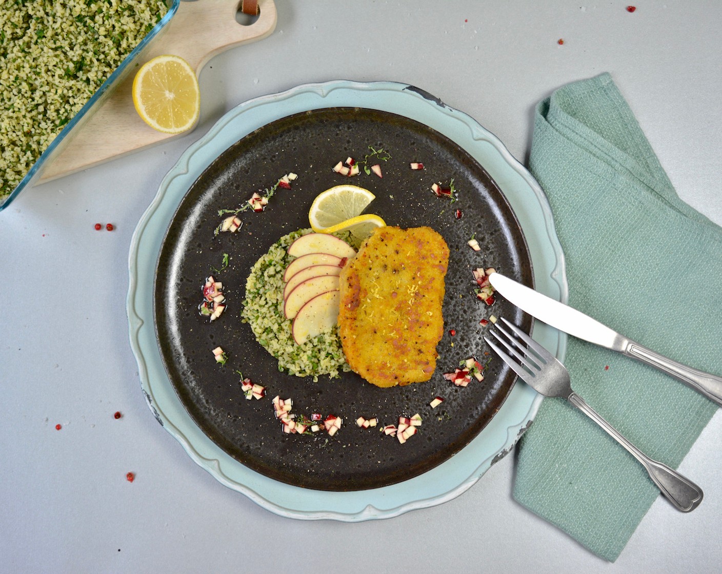 Zitronen-Pfeffer-Schnitzel auf grünem Bulgur.